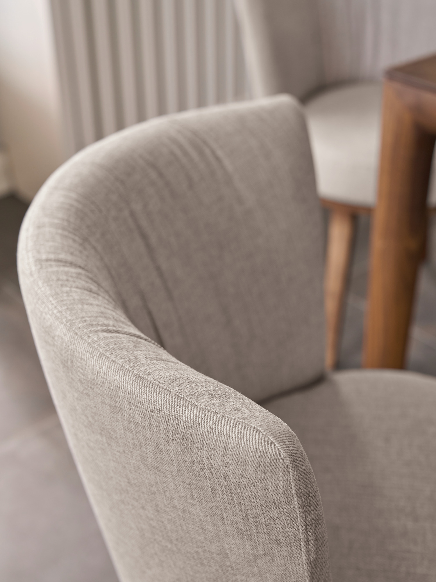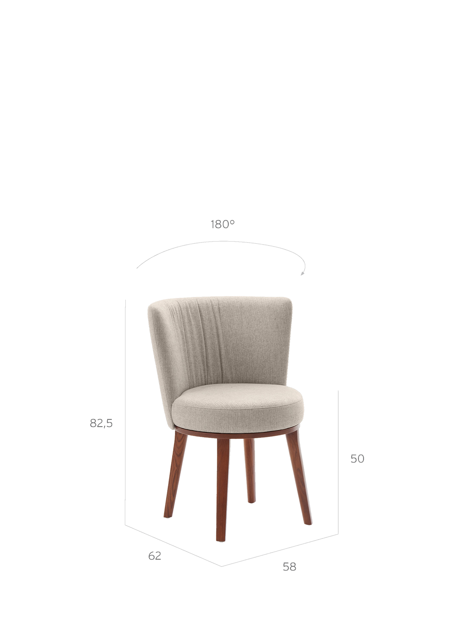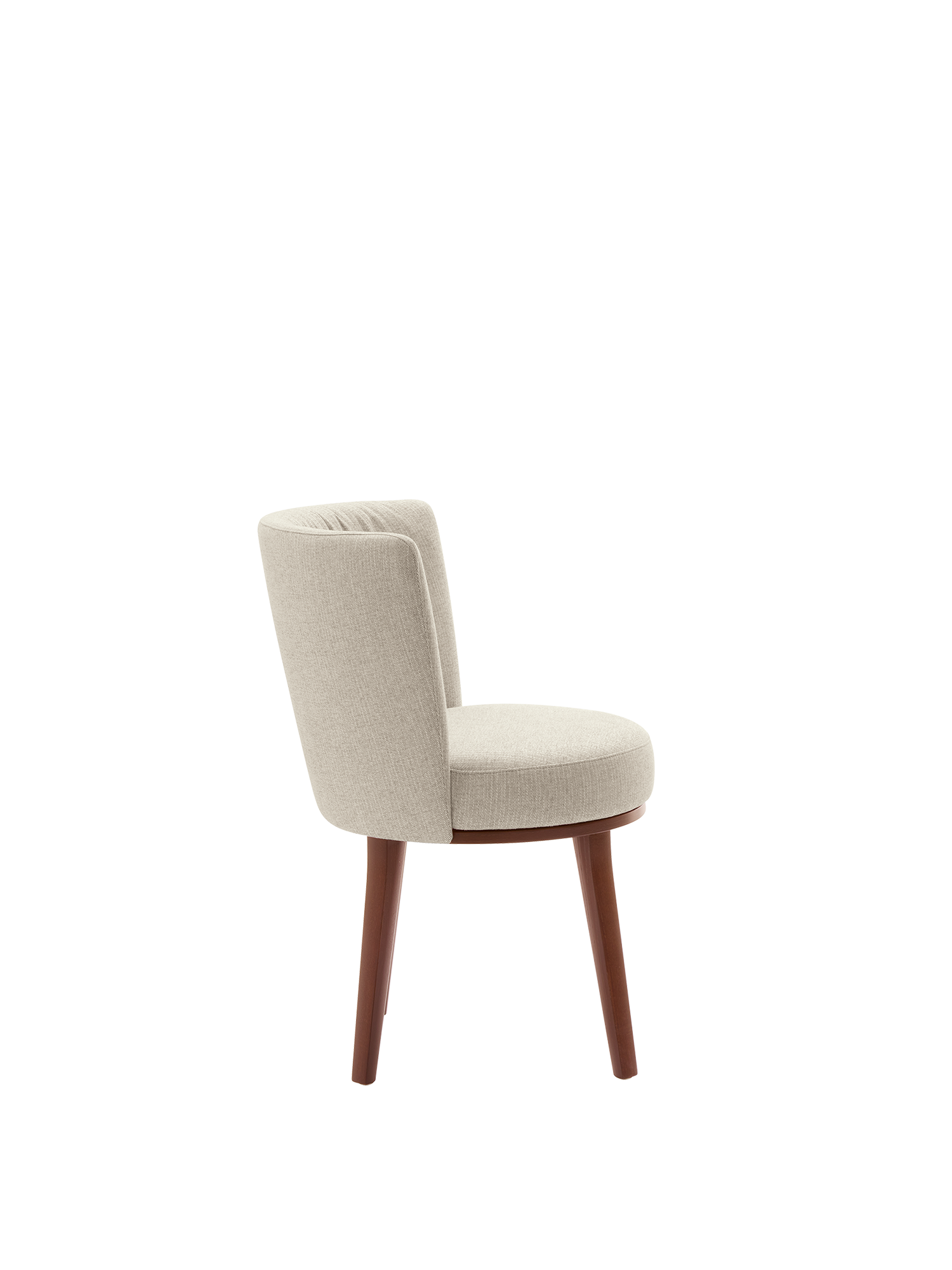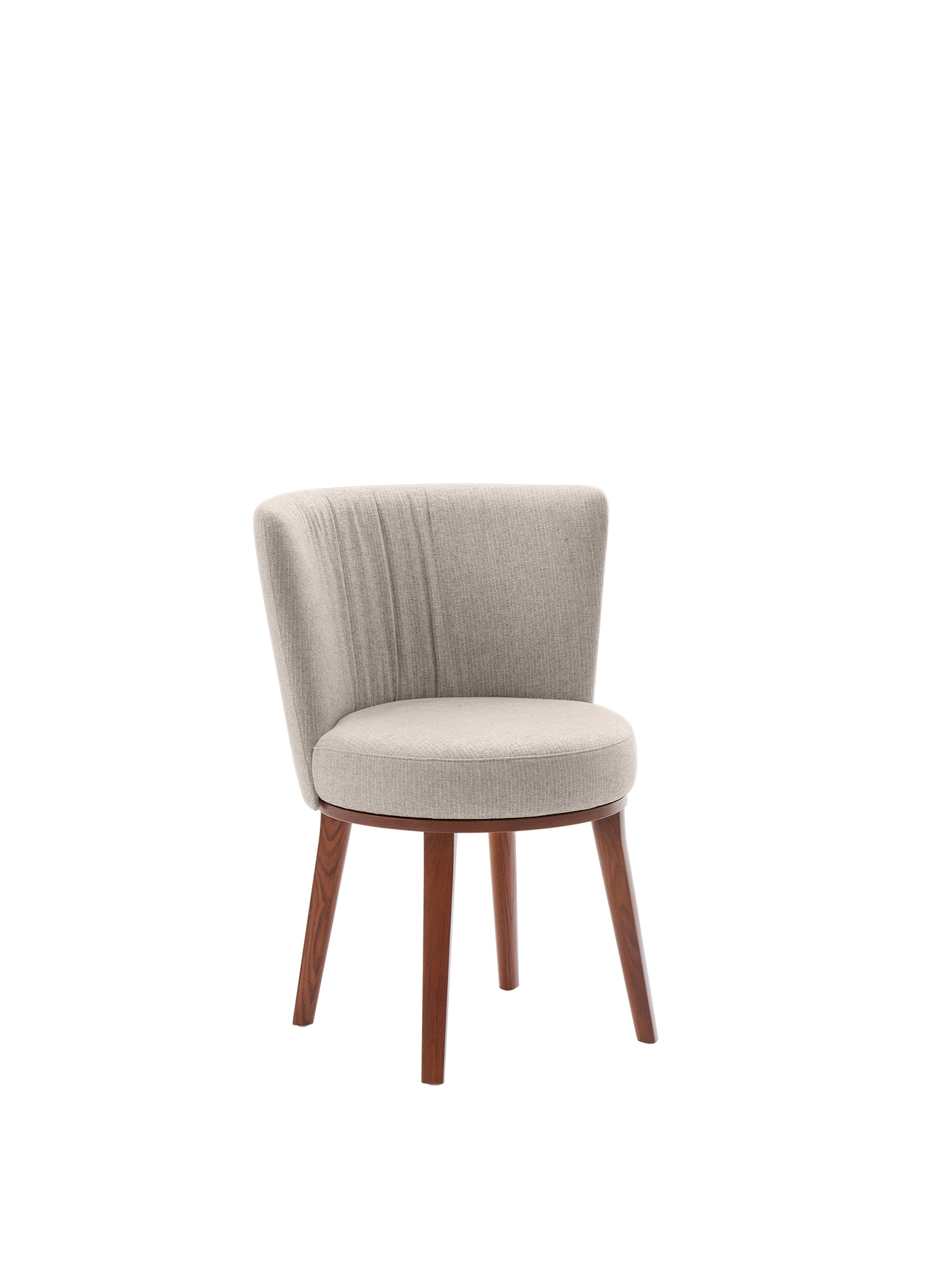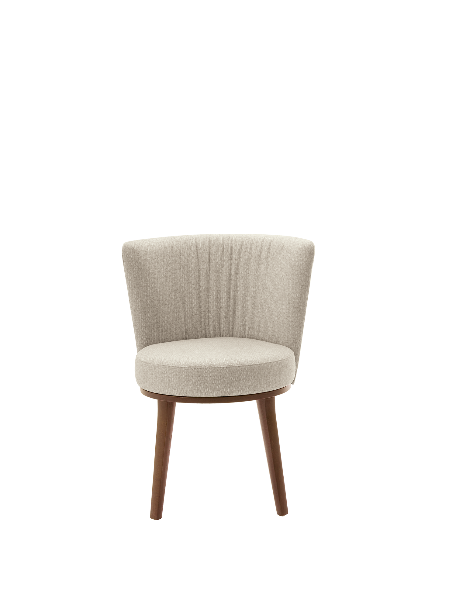 Mit seiner gerundeten Rückenlehne und dem weichen Veloursbezug bietet der Teano Stuhl alle Annehmlichkeiten eines Sessels – und noch etwas mehr: Die um 180 Grad drehbare Sitzfläche erlaubt ein bequemes Aufstehen, auch wenn der Stuhl einmal nicht vom Tisch zurückgeschoben werden kann. Das Gestell besteht aus geöltem amerikanischem Nussbaum. Auf Anfrage ist es auch in anderen Varianten erhältlich.