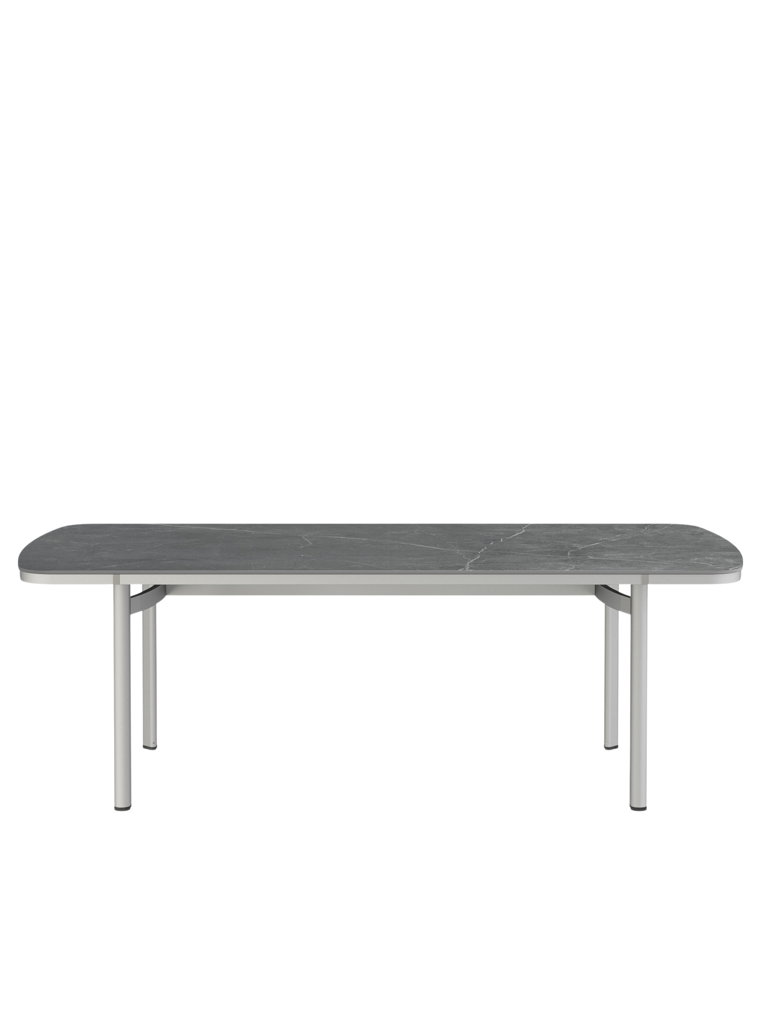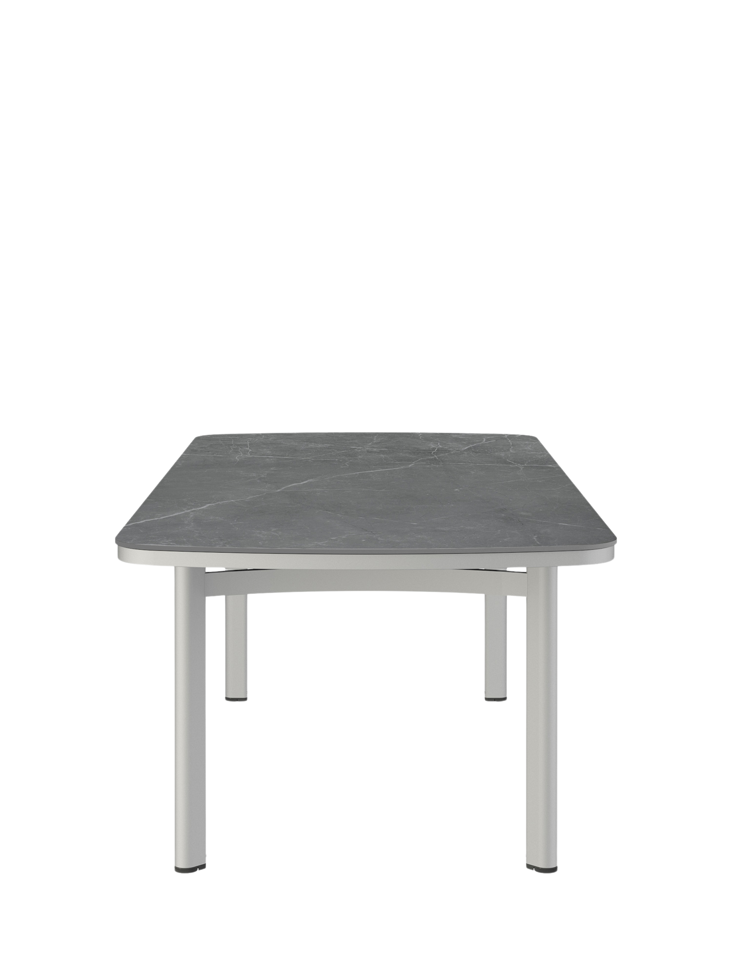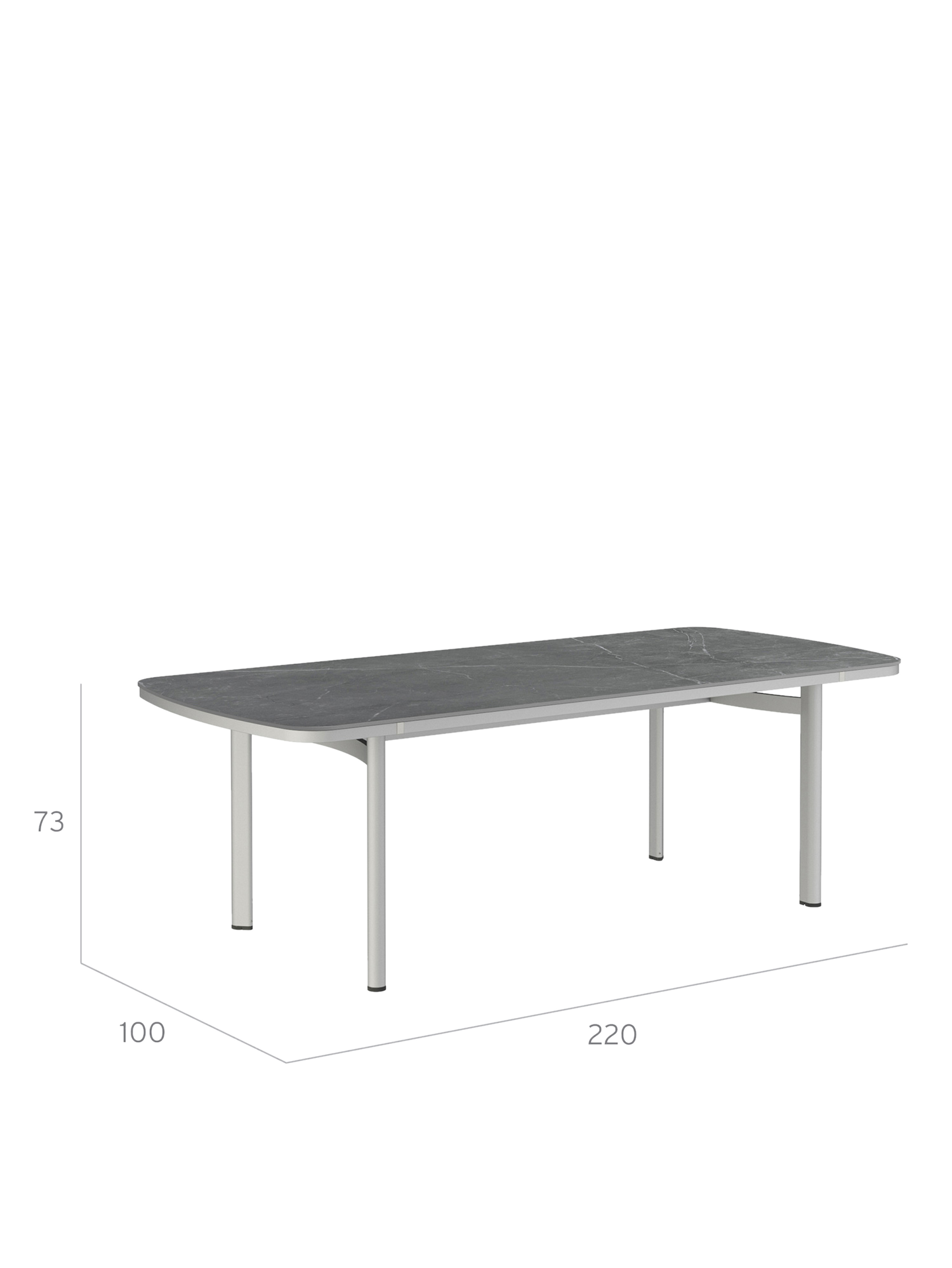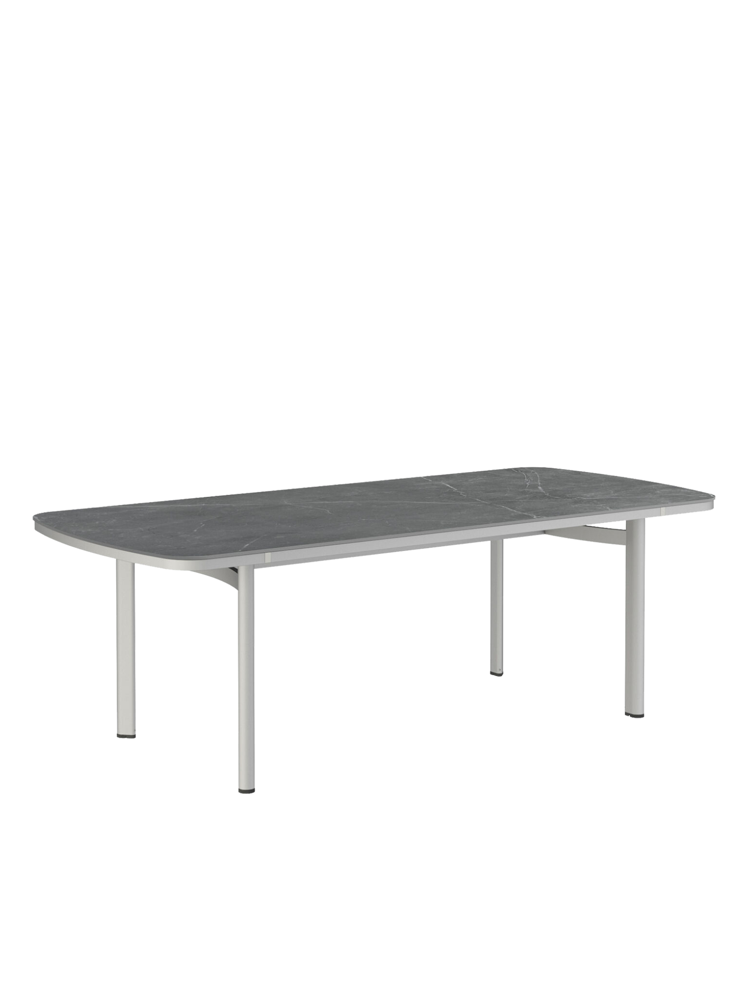 Die sanften Farbtöne der pflegeleichten und UV-beständigen Steinkeramikplatten harmonieren mit dem Geflecht der Kordeln und dem weich schimmernden Eloxal des Tischgestells. Die mattgrauen Oberflächen mit der Anmutung dekorativ gemaserten Marmors verleihen den großzügigen Tischen, die in drei Größen erhältlich sind, einen edlen Akzent.
