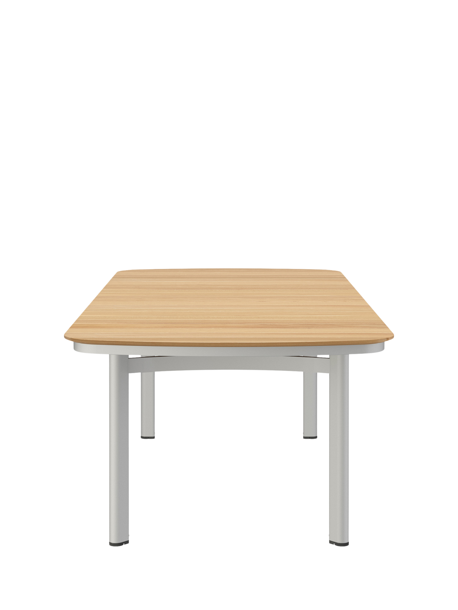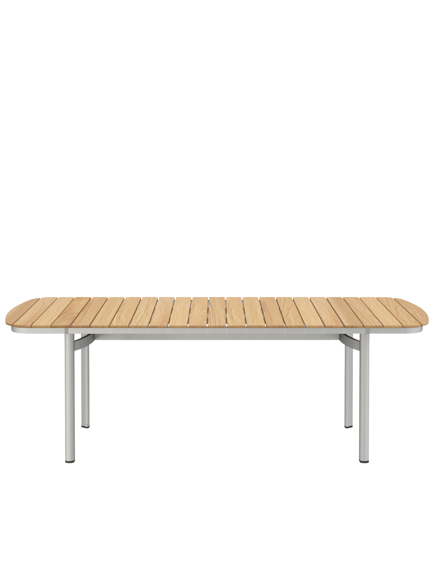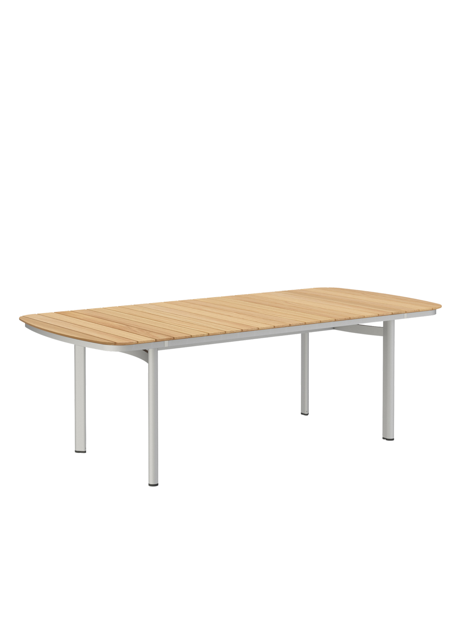 Die schlanke Tischplatte aus Teakholz liegt auf einem Rahmen aus eloxiertem Aluminium. Damit erscheint der Temper Tisch Teak so leichtfüßig wie bodenständig und kombiniert ein natürliches Aussehen mit schimmerndem Eloxal.