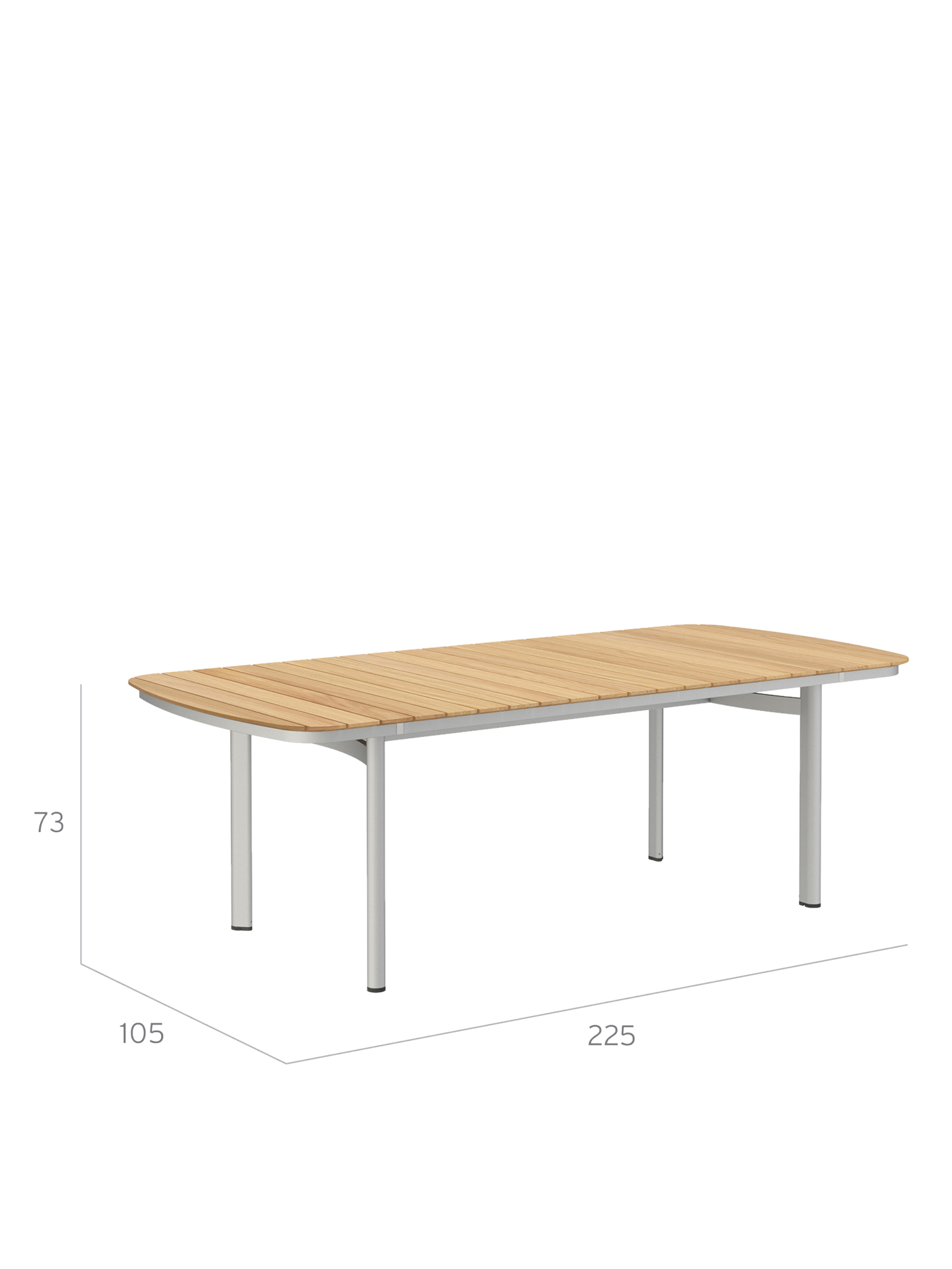 Freiheit genießen: Passend zum Temper Armlehnstuhl wurde auch ein großzügiger Esstisch mit Teakholzplatte und einem Rahmen aus eloxiertem Aluminium entworfen. Mit zwei verschiedenen Größen haben 4 bis 6 Personen Platz am Temper Esstisch Teak.