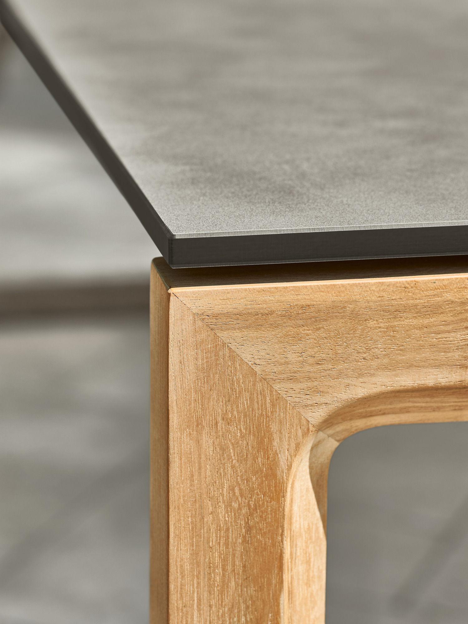 Die passenden Bänke der Serie, mit oder ohne Lehne, gleichen in ihrer Konstruktion aus Teakholzrahmen und Kunstharzplatten dem Tisch. Nach geselligen Abenden oder bei Dauerregen können sie in voller Länge unter ihm verschwinden und bilden gemeinsam eine kompakte Quaderform.