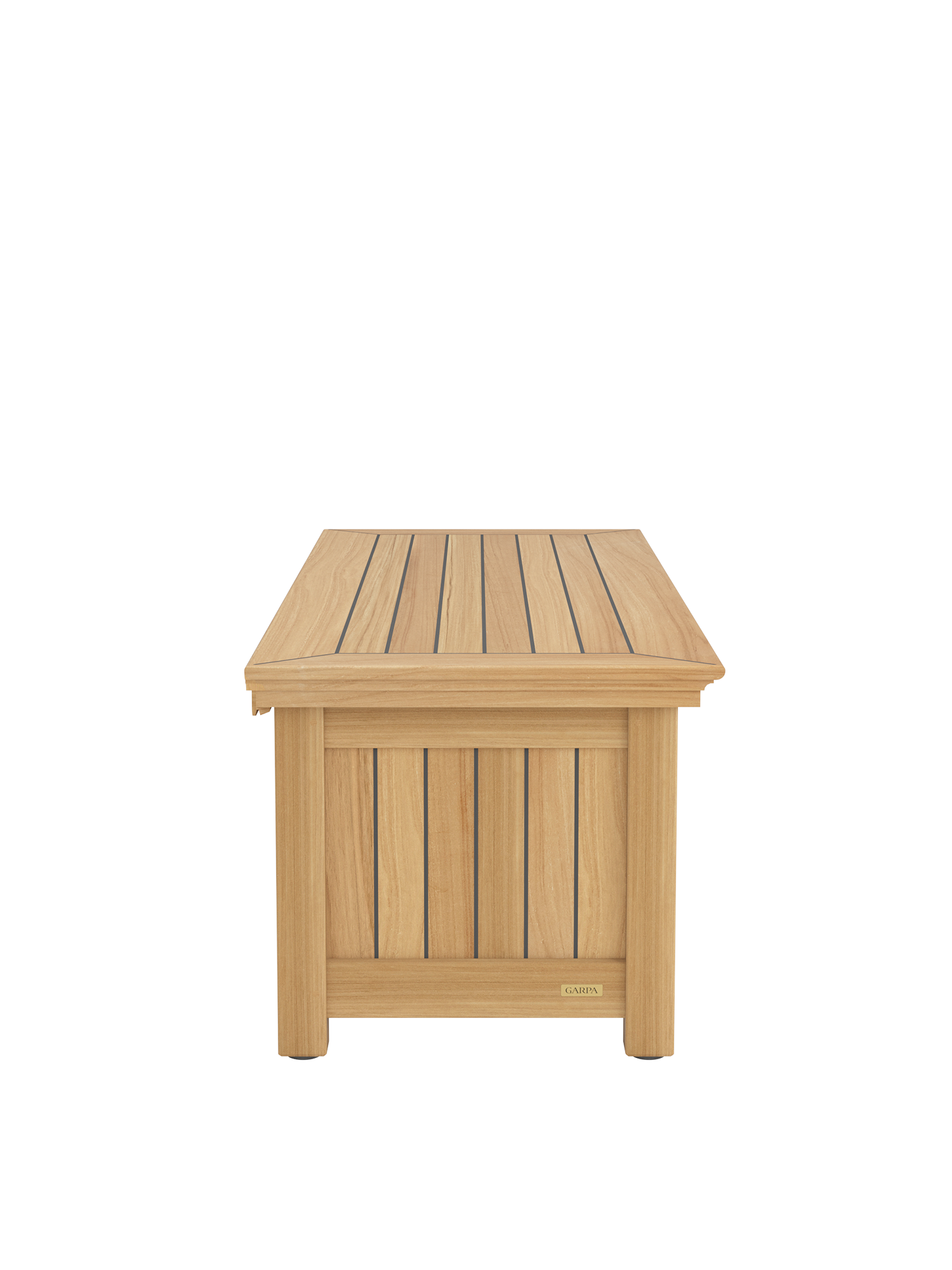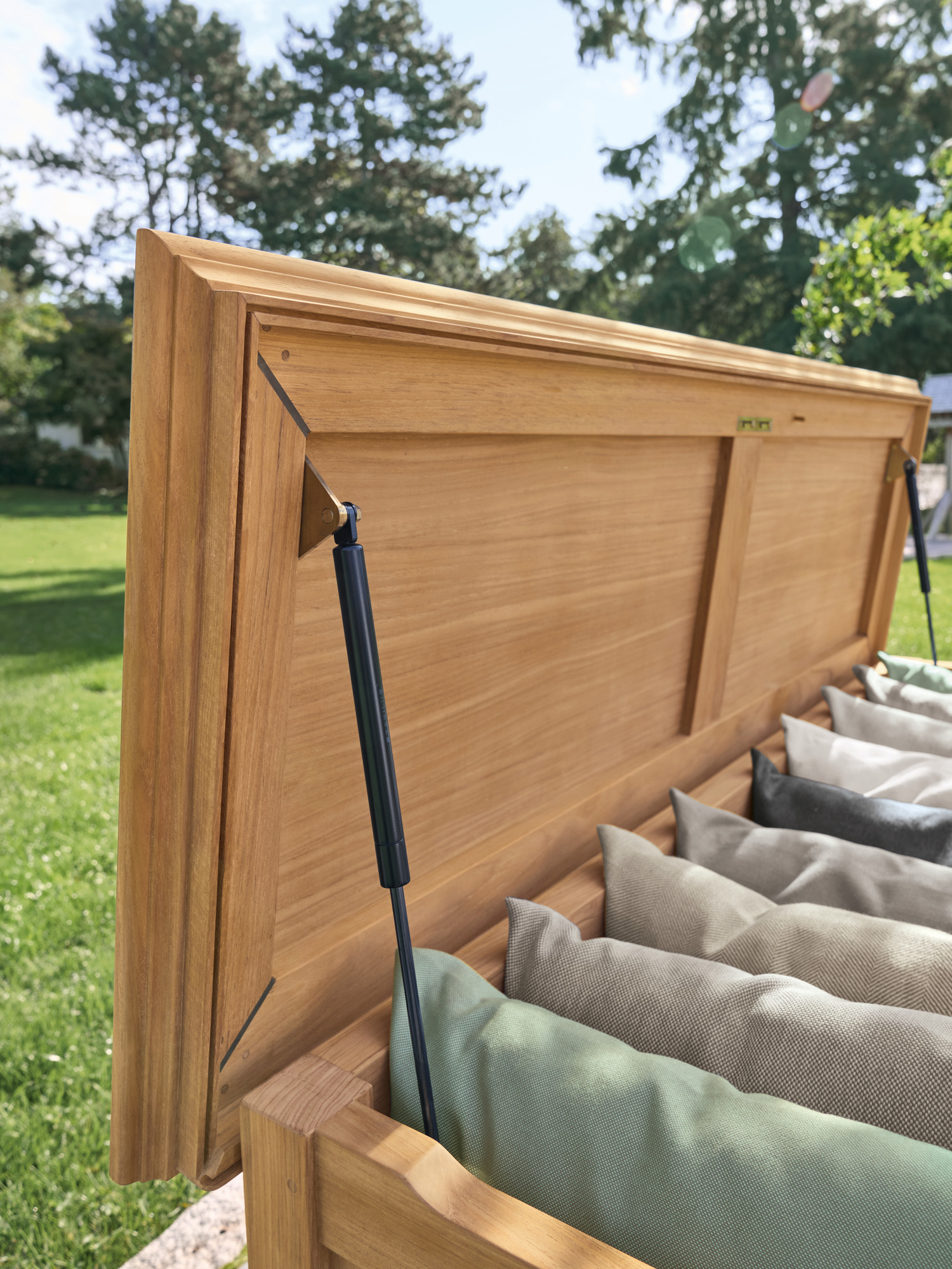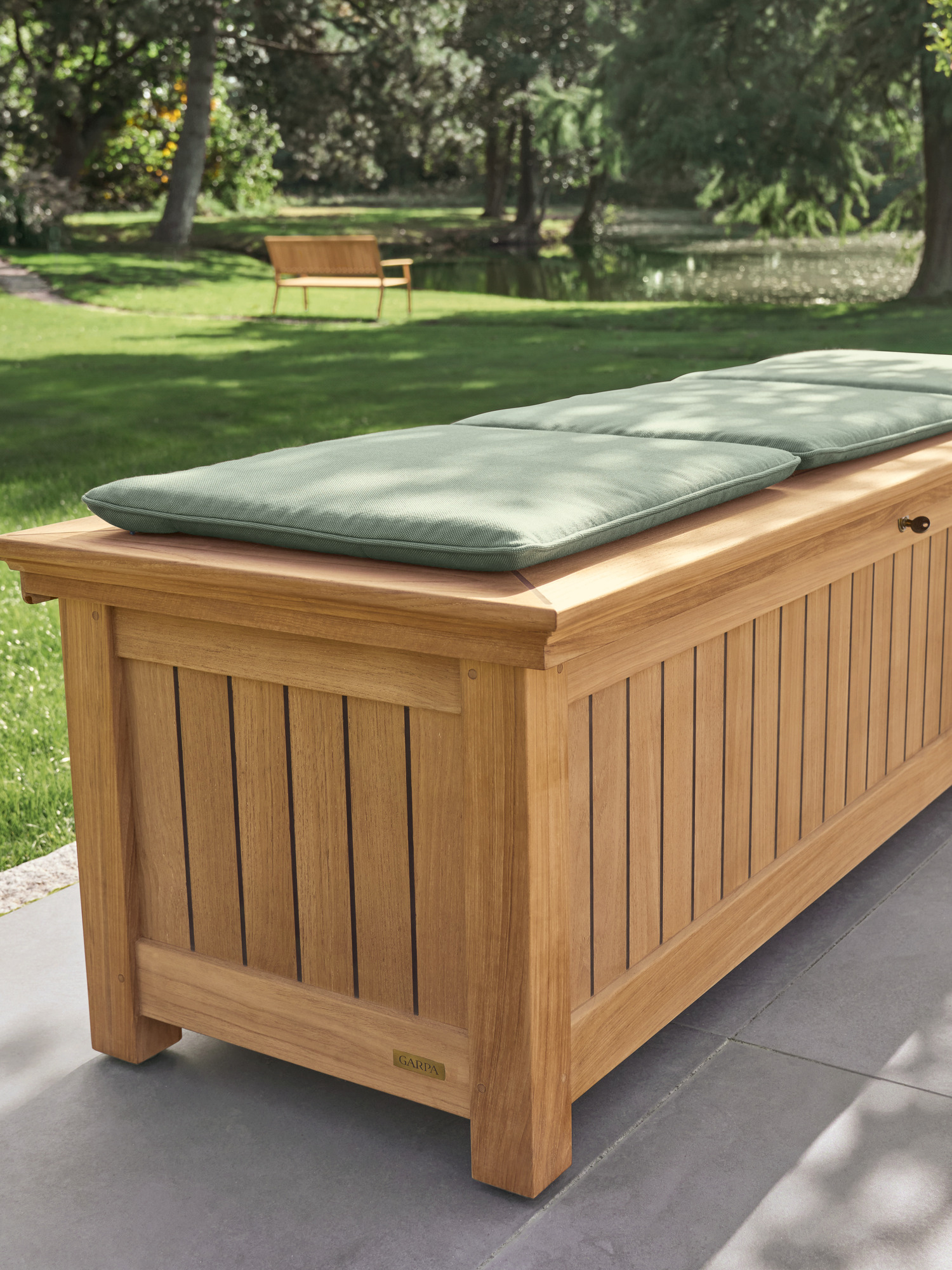 Die Kissentruhen für die Auflagen der Garpa Gartenmöbel zeigen sich perfekt in Form und Funktion. Alle konstruktiven Bauteile sind aus massivem Teak. Die Seiten und der Deckel bestehen aus wetterfestem Schichtholz, das mit 2,5 mm starkem Teak furniert und wie die Deckplanken von Hochseeyachten verfugt ist. Schloss und Scharniere sind aus hochwertigem Messing und Edelstahl.