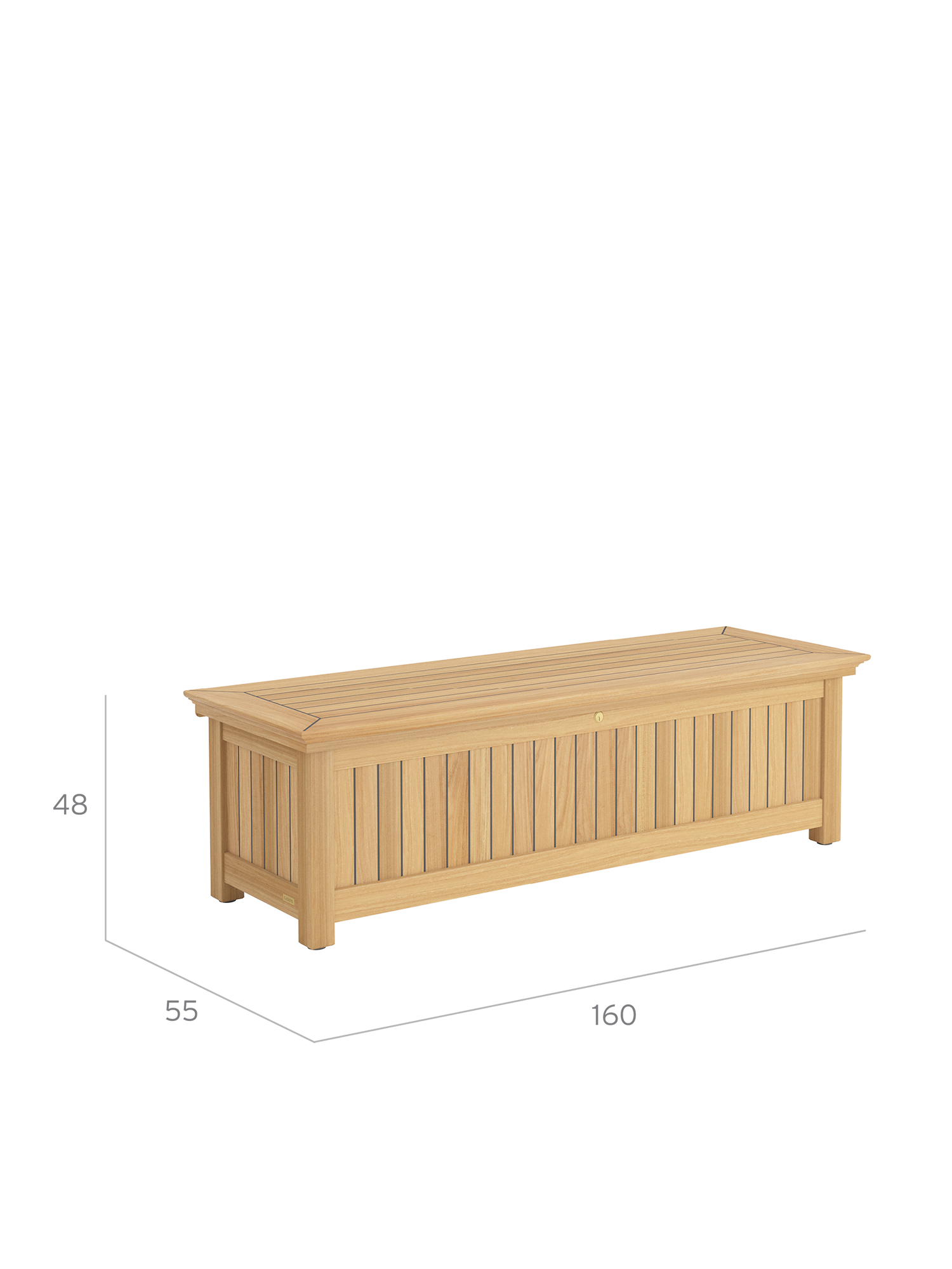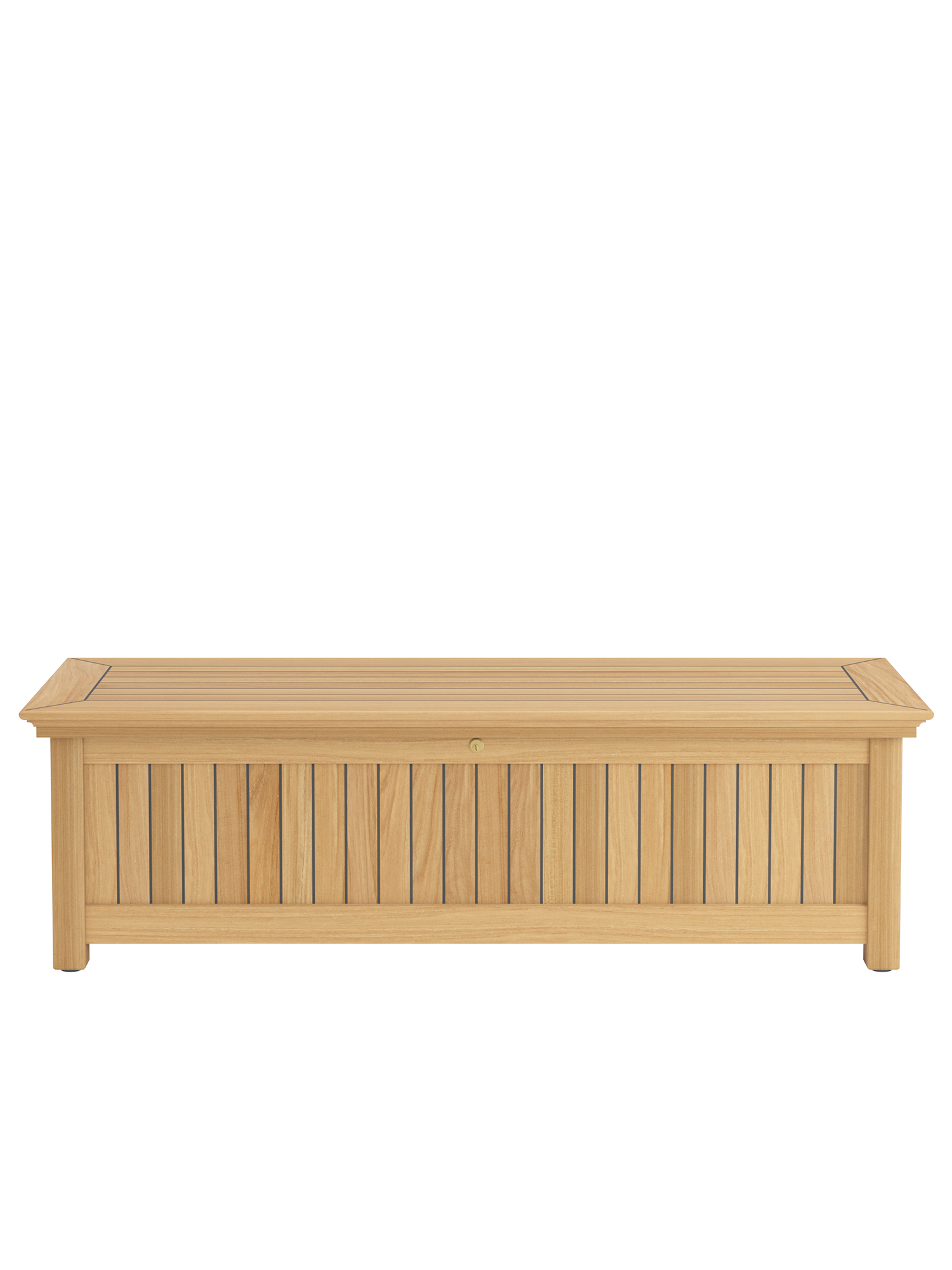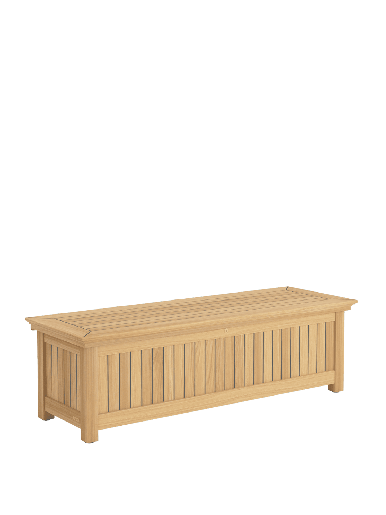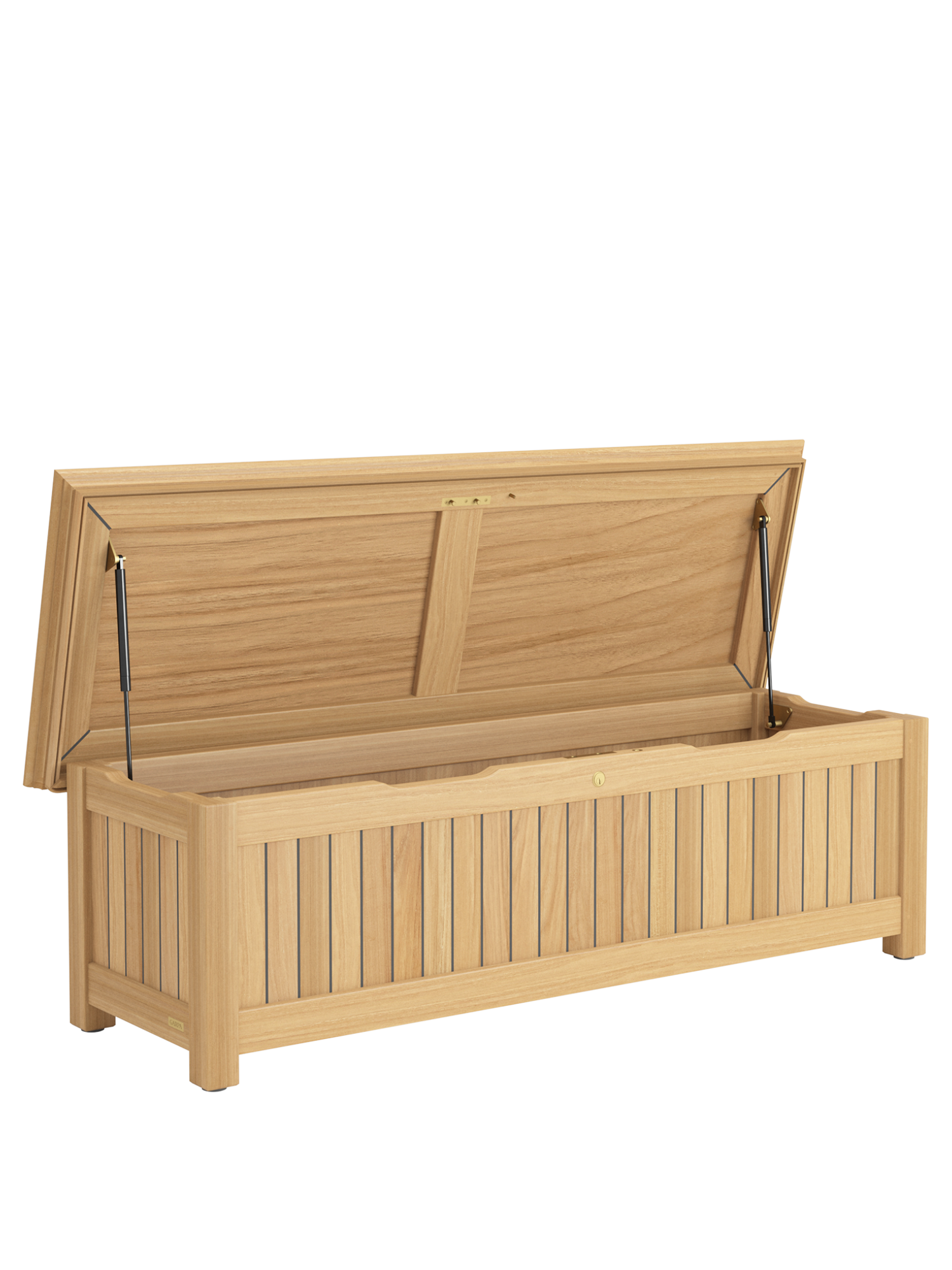 Die Kissentruhen für die Auflagen der Garpa Gartenmöbel zeigen sich perfekt in Form und Funktion. Alle konstruktiven Bauteile sind aus massivem Teak. Die Seiten und der Deckel bestehen aus wetterfestem Schichtholz, das mit 2,5 mm starkem Teak furniert und wie die Deckplanken von Hochseeyachten verfugt ist. Schloss und Scharniere sind aus hochwertigem Messing und Edelstahl.