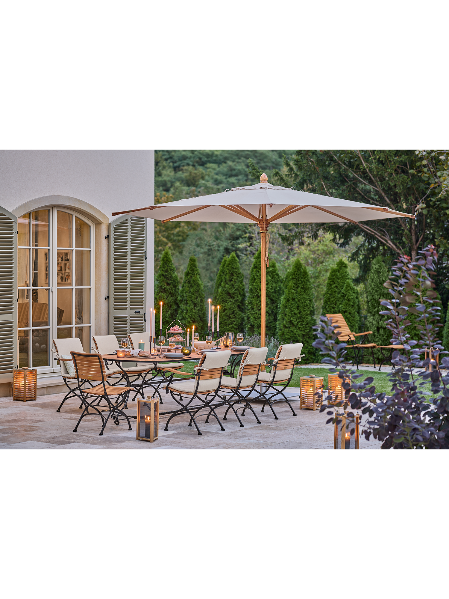 Lichter Schatten: Der Umbria Sonnenschirm filtert das Sonnenlicht und dämmt mit großzügigen Spannweiten die Hitze des Tages auf Wohlfühltemperatur - diese wohlige Wärme speichert das Sommerdach bis in den Abend hinein.