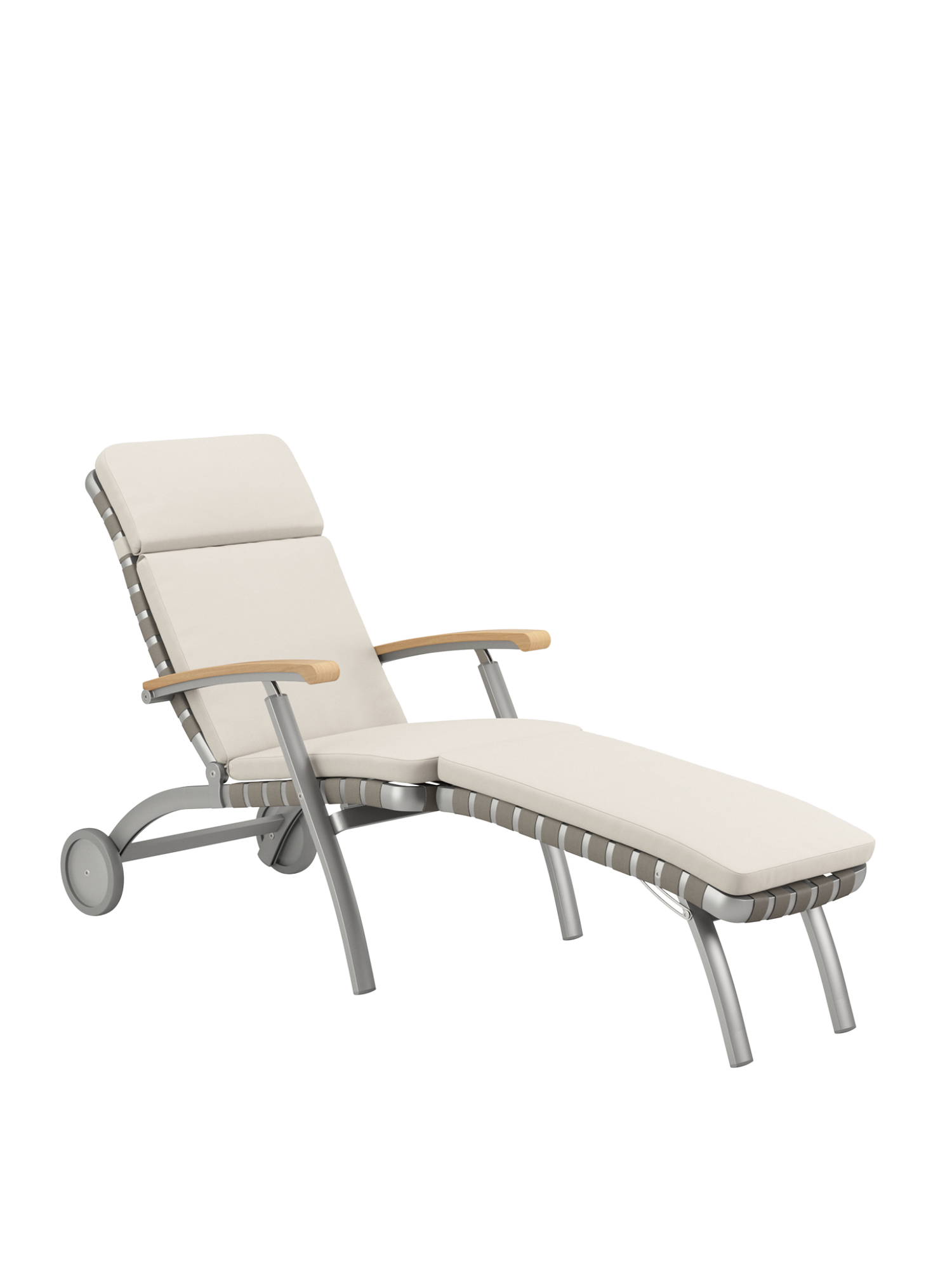 Die Neuauflage des klassischen Deck Chairs besteht aus einem seidig schimmernden, eloxierten Aluminiumrahmen in Kombination mit einem farblich korrespondierenden Gurtgeflecht. Aufwendige Kedertechnik verbindet Rahmen und Geflecht des individuellen Liegestuhls, gewährt angenehmen Halt und bietet ergonomischen Komfort. Sanft gewölbte Armlehnen aus Teak schmeicheln den Händen. Mit seiner verlängerten Fußstütze empfiehlt sich der Deck Chair besonders für Menschen ab 1,80 Meter Körpergröße. Seine Rückenlehne lässt sich fünffach verstellen. Geliefert wird er mit einer bequemen Nackenrolle im Farbton Stone.