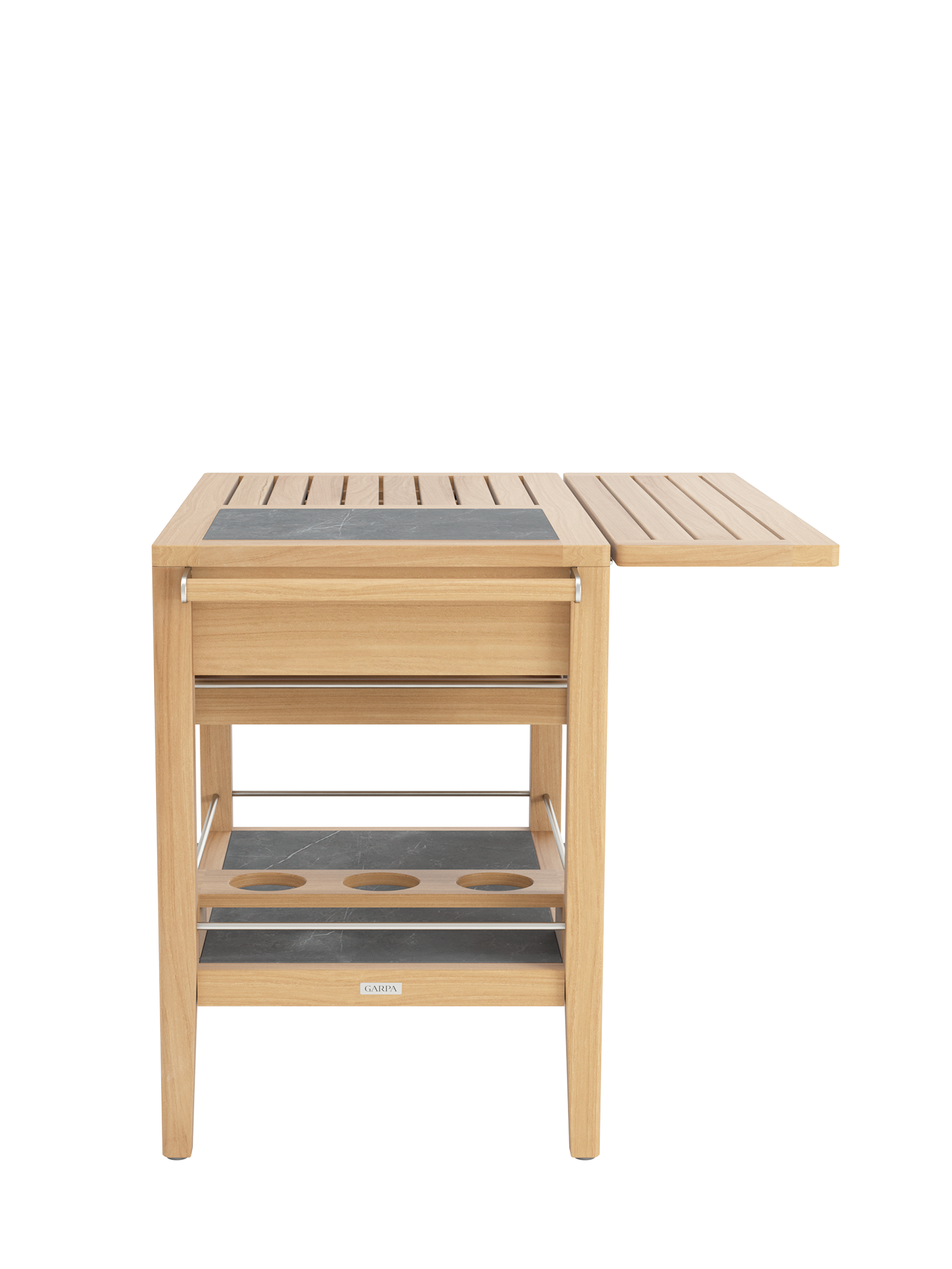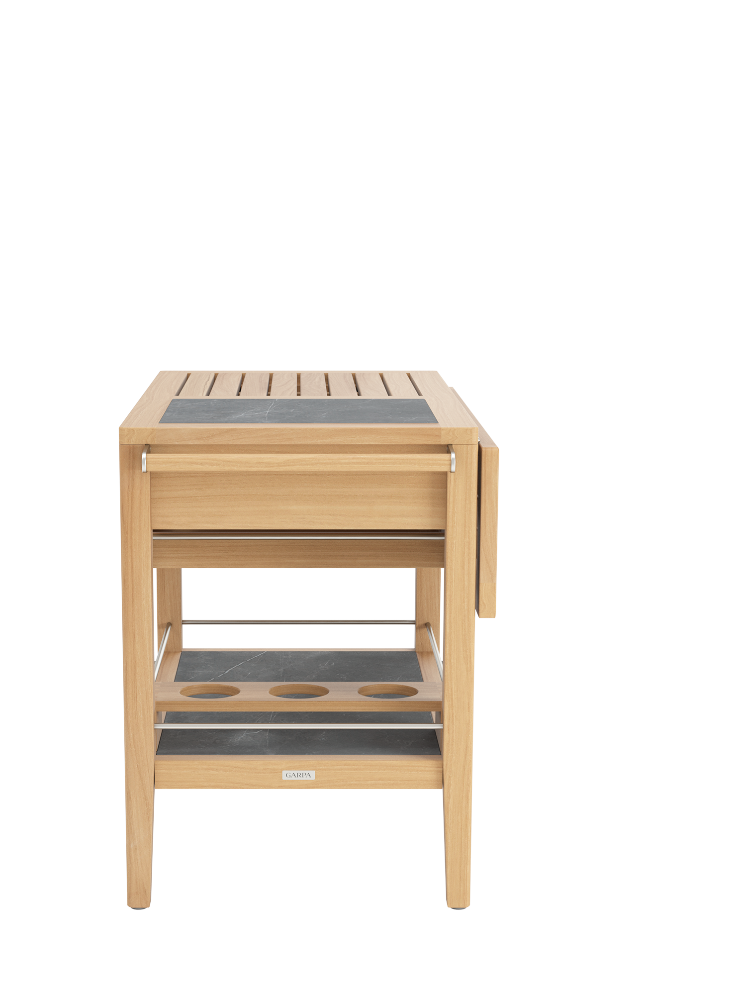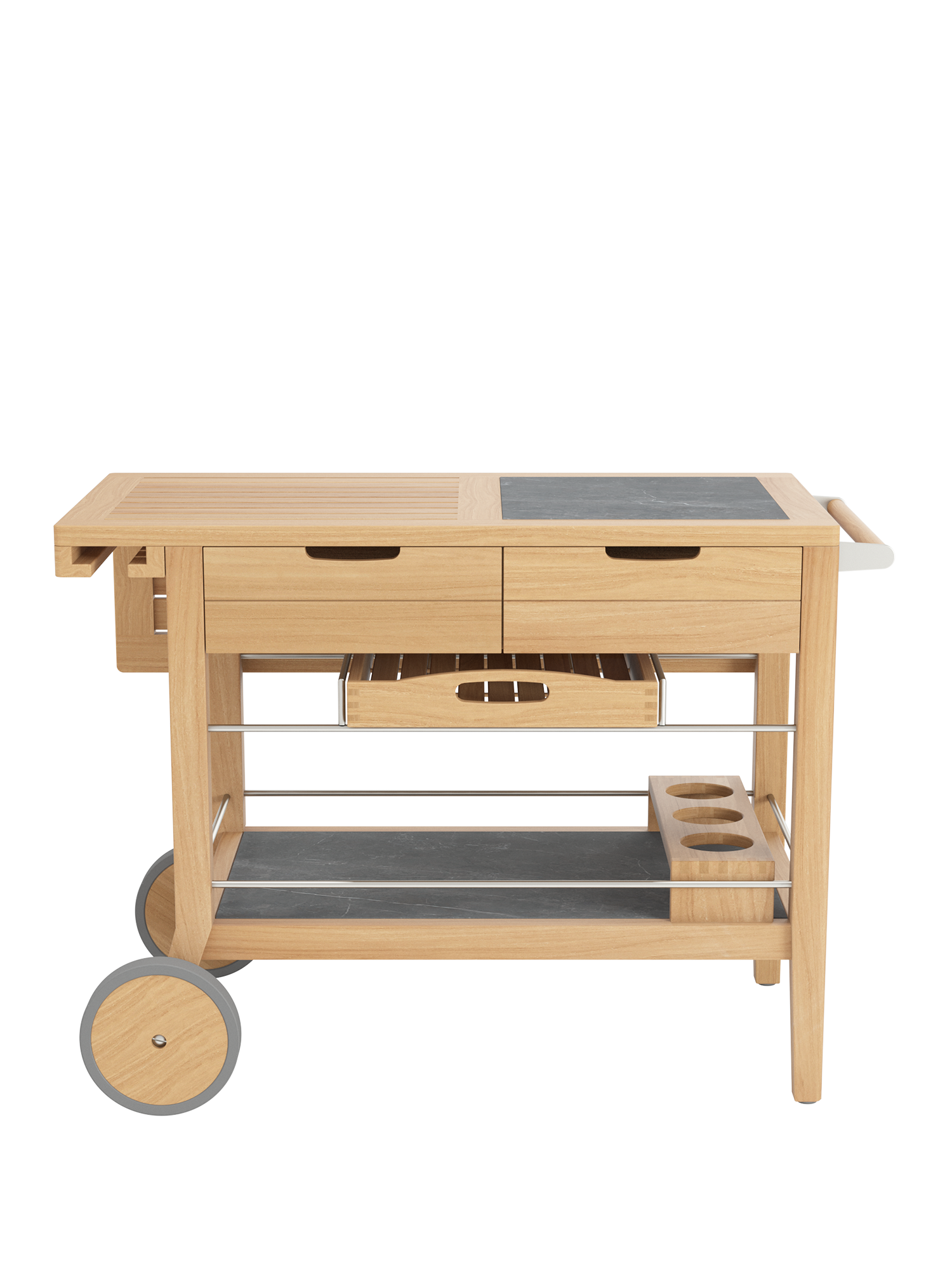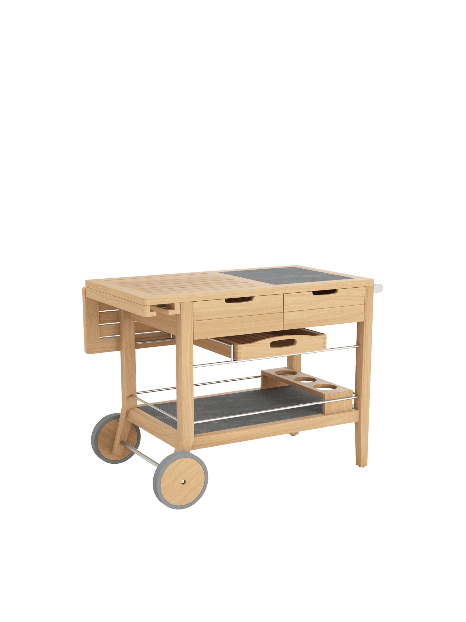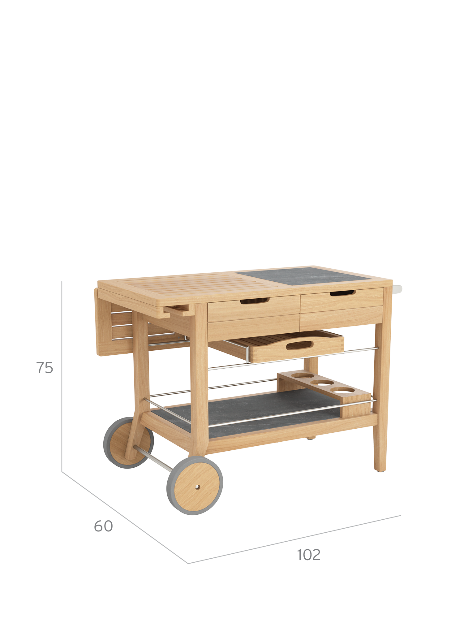 Ein flexibles Multitalent für zwanglose Gartenfeste und lange Sommerabende: Im geradlinigen Design aus wetterfesten Materialien bietet der moderne Barwagen eine überzeugende Vielfalt von Funktionen. Seine großzügige Arbeitsfläche aus Teakleisten lässt sich mit einem abklappbaren Element noch erweitern. Ein Einlegeboden aus frostfester, grauer Keramik dient als Schneidebrett und bildet einen feinen Kontrast zum warmen Farbton des Holzes. Zwei große Schubladen (Höhe je 7 cm) mit Böden aus Teakleisten bieten Stauraum für Servietten und Barutensilien. Ein herausnehmbares Teaktablett lässt sich auf der darunterliegenden Reling verschieben.