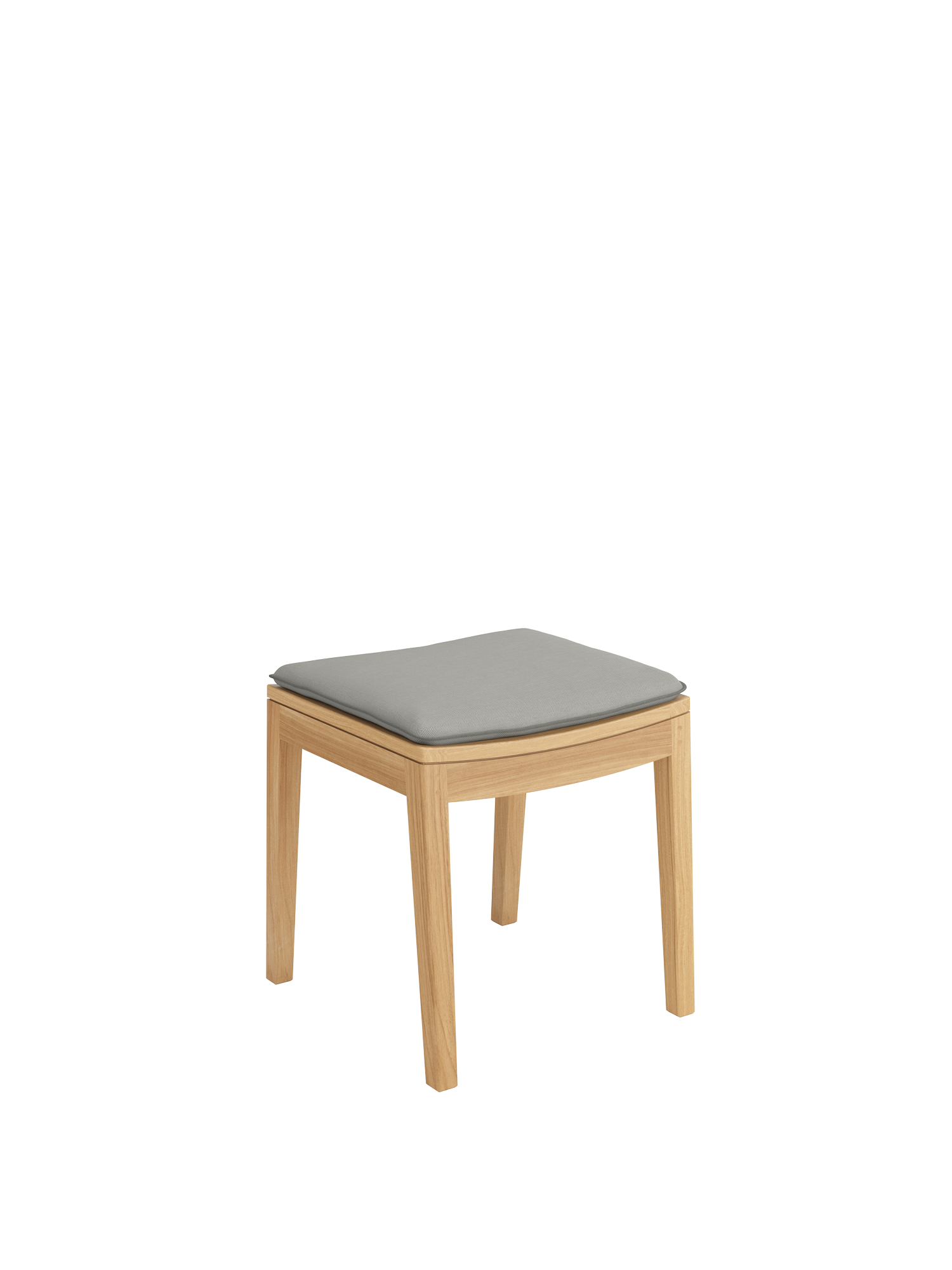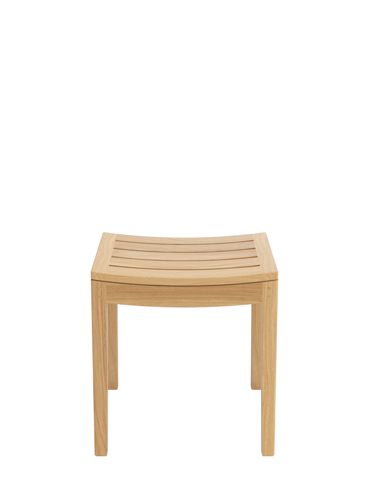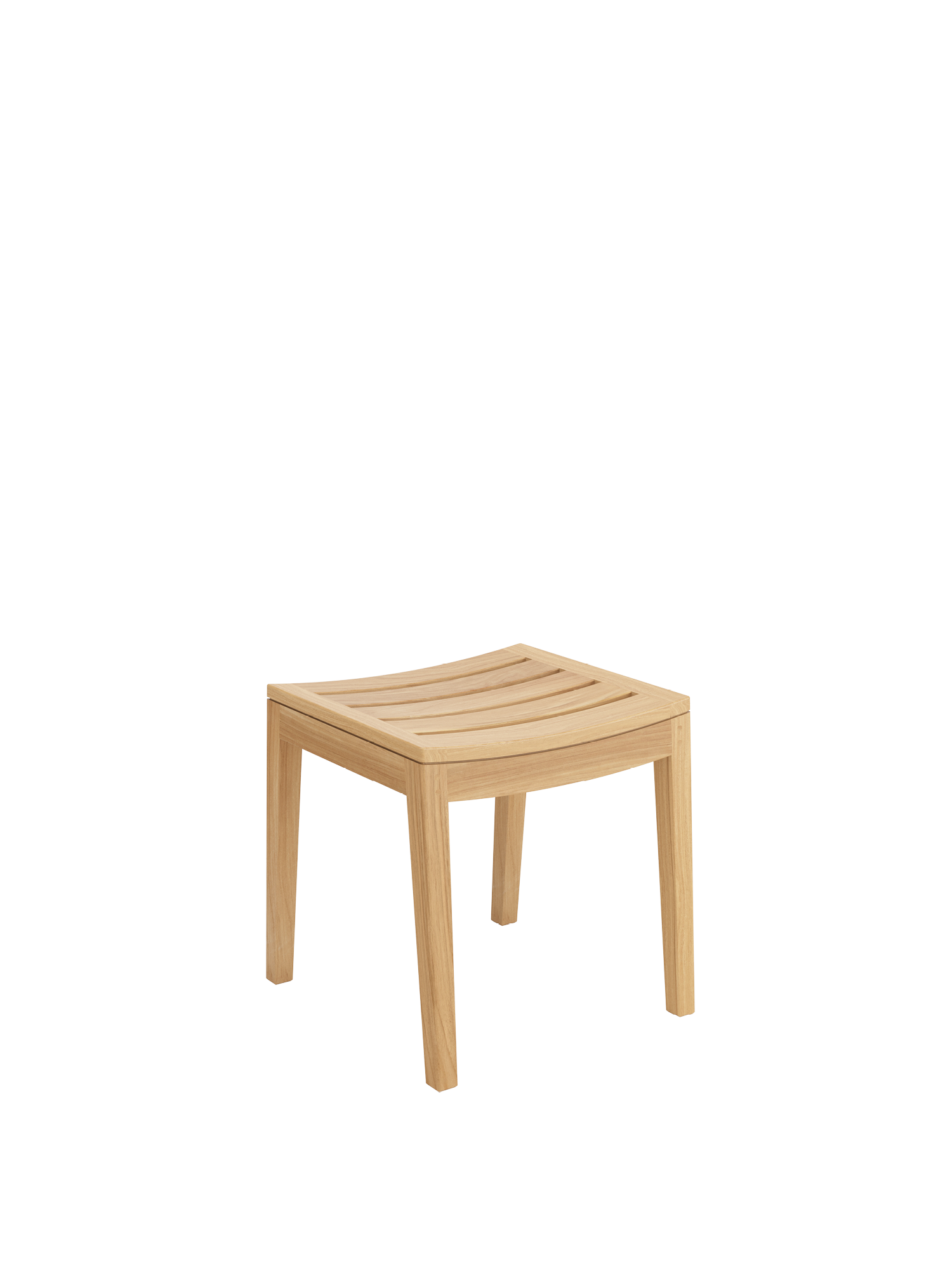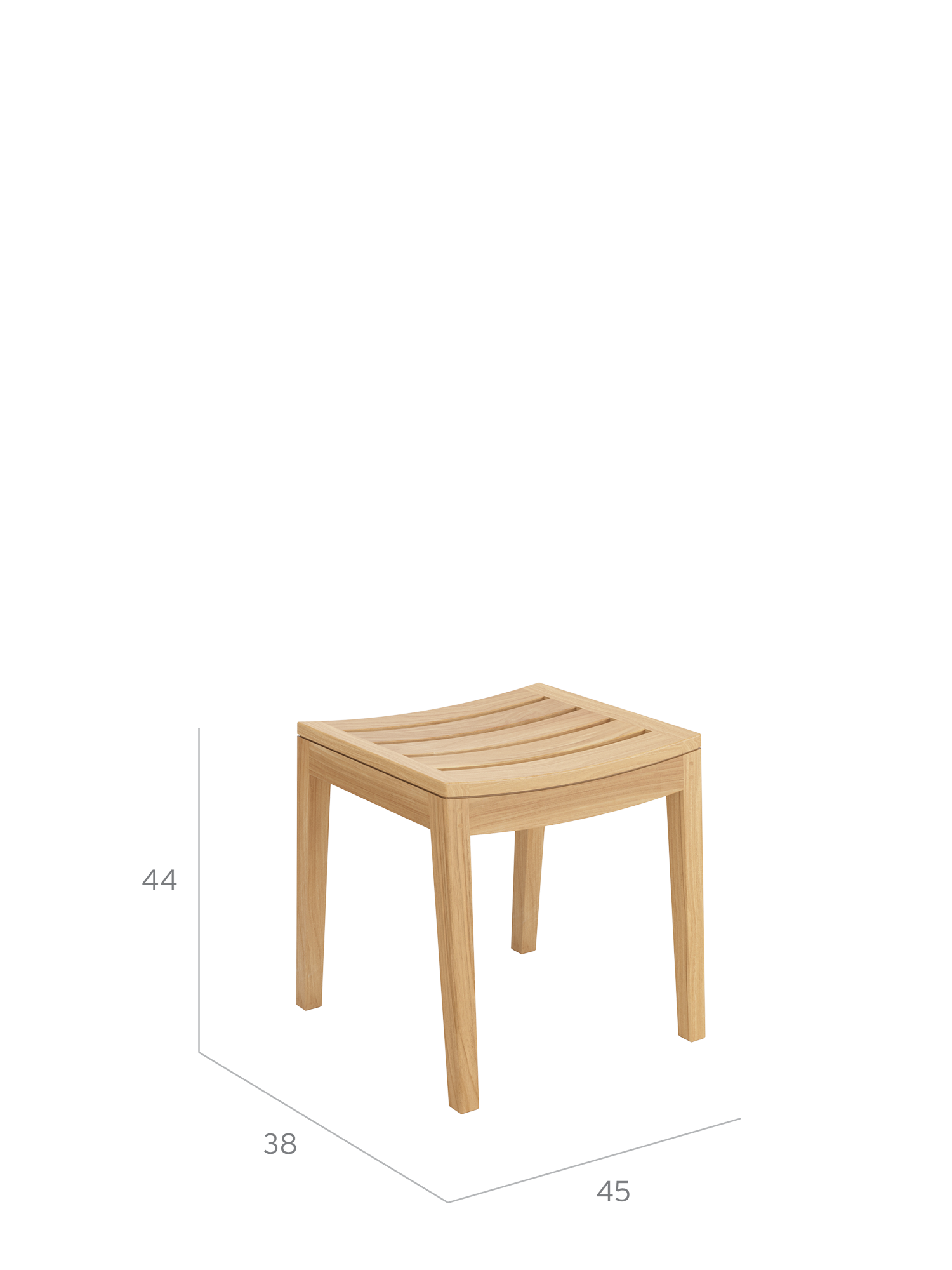 Mit seiner ergonomisch geformten Sitzfläche aus Teak empfiehlt sich der Hocker als unkomplizierter Sitzplatz und komfortable Ablage für die Beine zugleich.