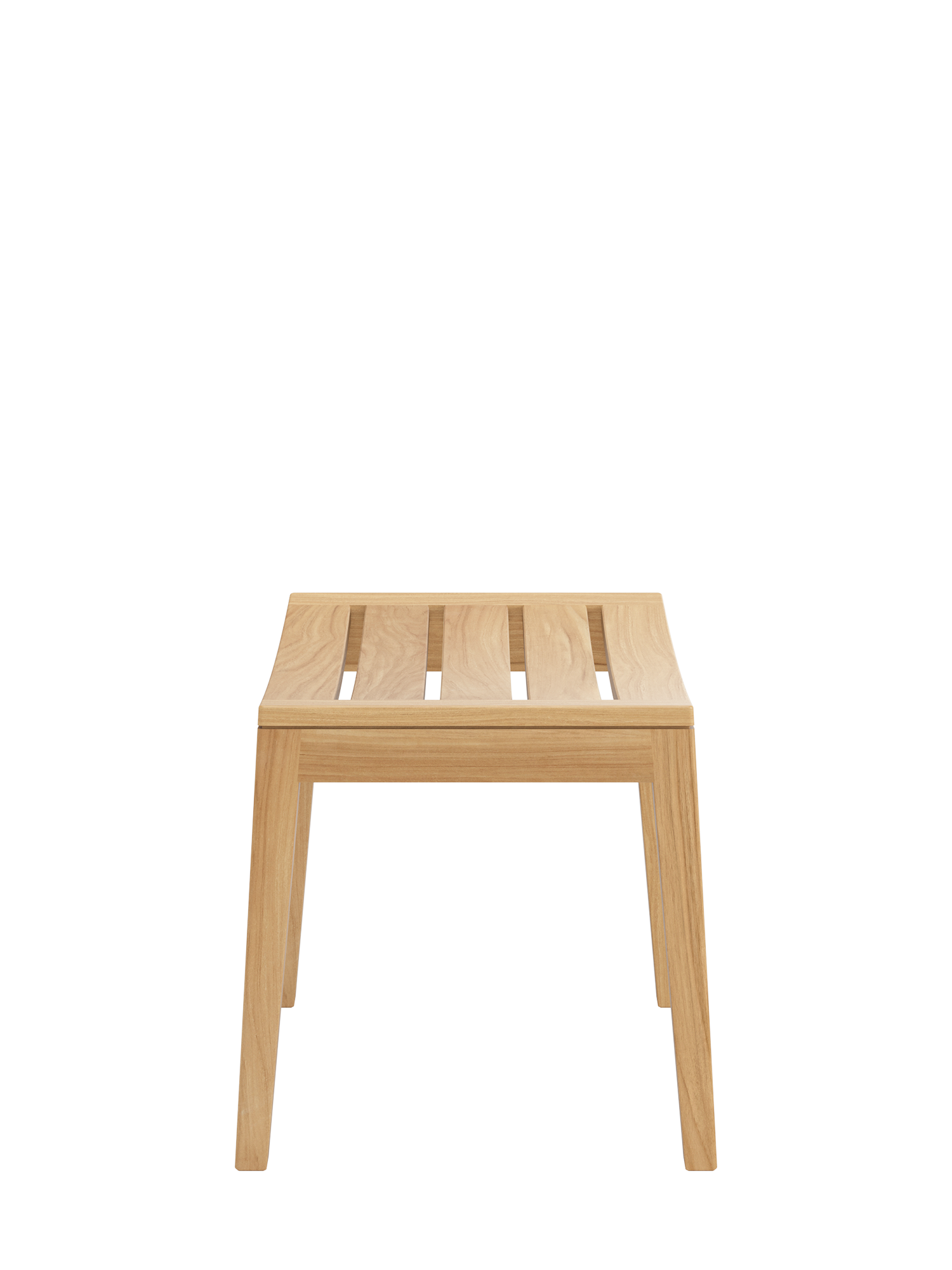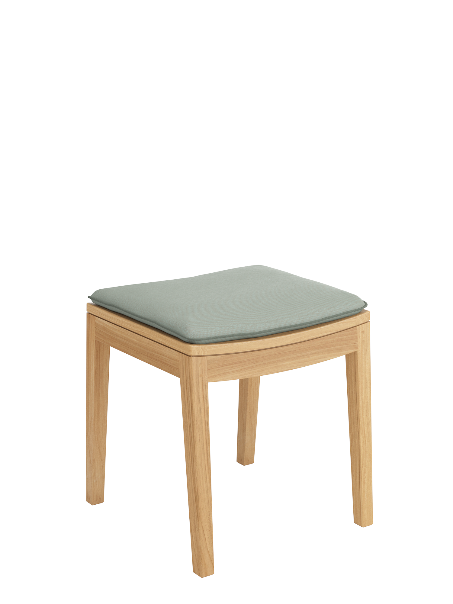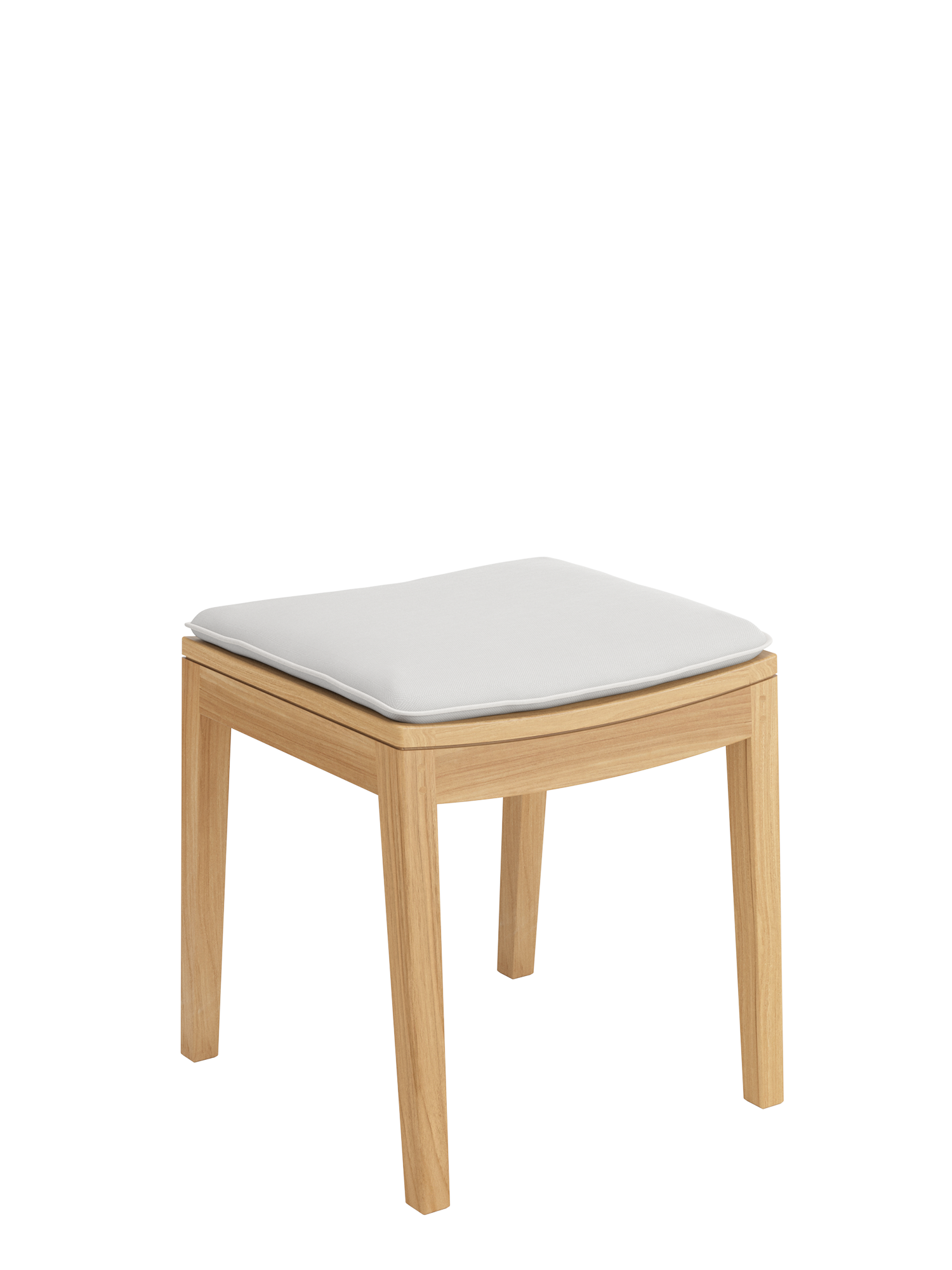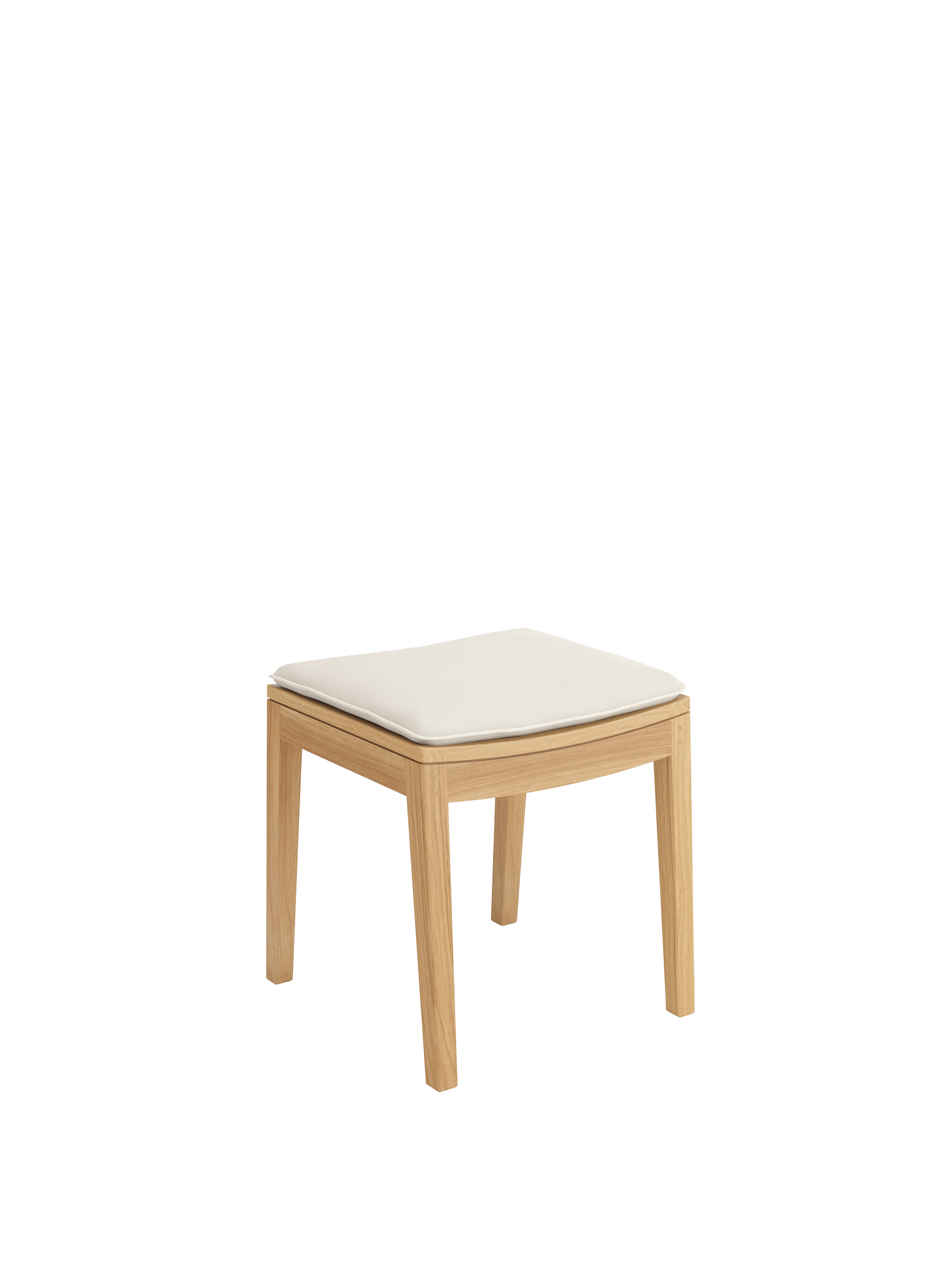 Mit seiner ergonomisch geformten Sitzfläche aus Teak empfiehlt sich der Hocker als unkomplizierter Sitzplatz und komfortable Ablage für die Beine zugleich.