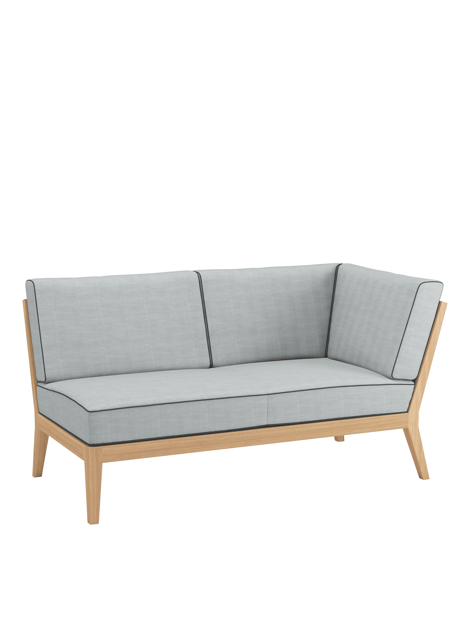 Ein Hocker dient mit aufgelegtem Polster als Sitz, ein Couchtisch mit Keramikplatte und in passender Höhe erweitert die Möglichkeiten. Eine zusätzliche Komponente, mit gleichem Maß und ausgestellten hinteren Beinen lässt sich lückenlos einreihen – wahlweise als Mittel- oder Endelement ohne Lehne. Alle Elemente finden Sie unter „Weitere Produkte der Serie“ weiter unten auf dieser Seite.