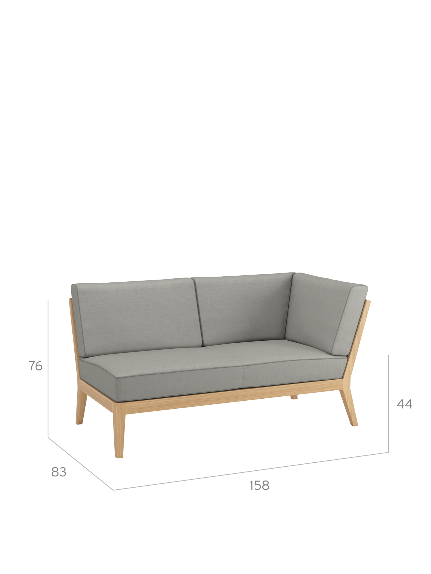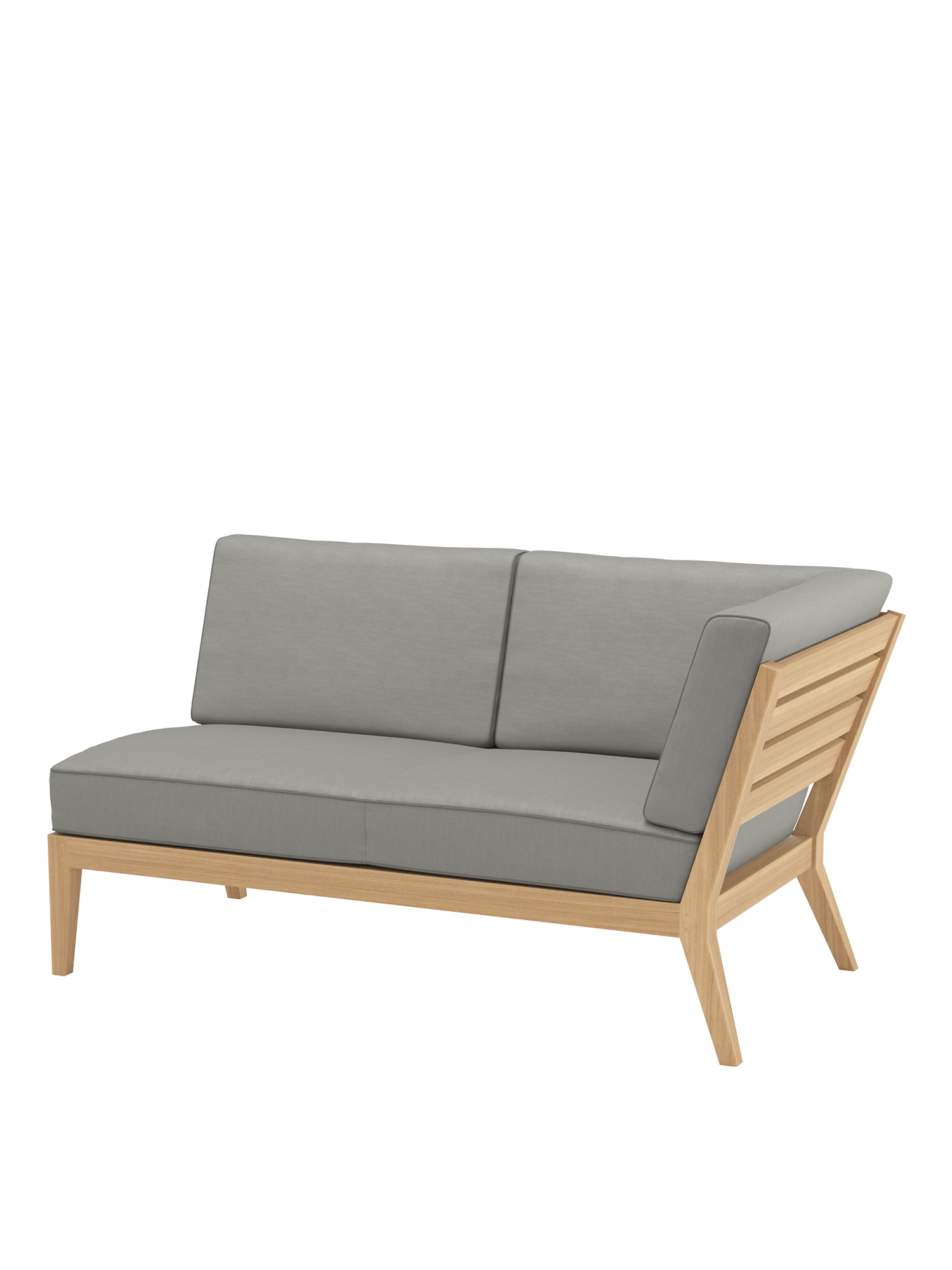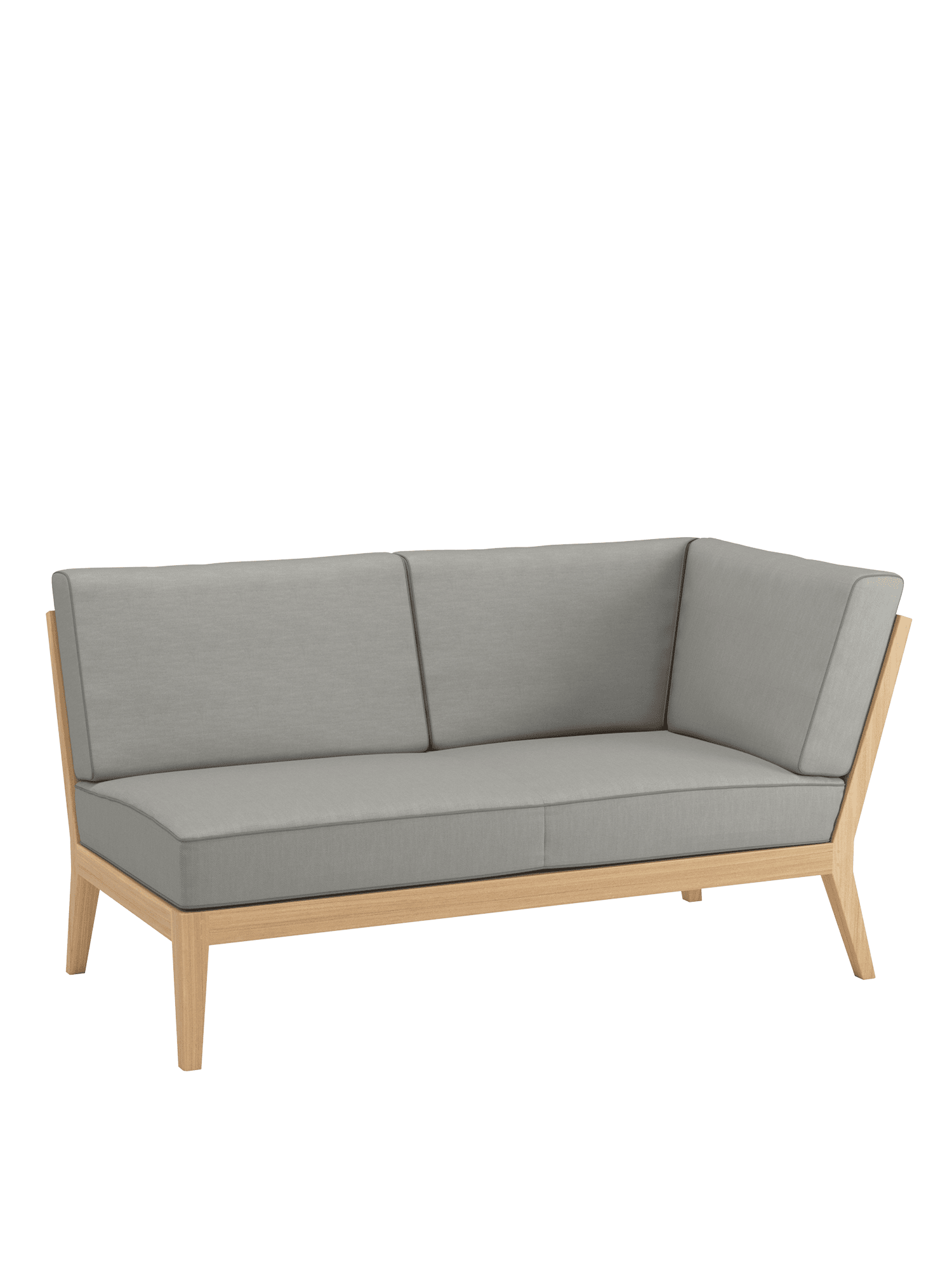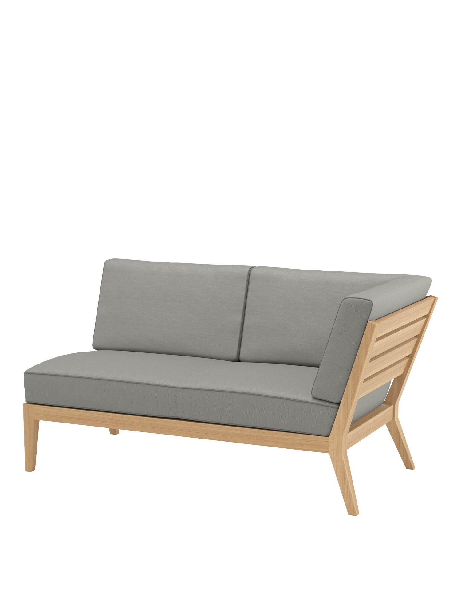 Am Ufer des Schwimmbeckens oder am Rand der Terrasse, auf einem Stadtbalkon oder mitten im Garten: Mit Elementen der Valencia Lounge findet ein Ruhepol in jeder luftigen Lage zur angemessenen Größe. Extra breit und besonders tief, bieten Chaiselongues, Mittelelemente und Eckmodule aus Teak mit ihren quer verlaufenden Sitz- und Rückenlehnen und ausgestellten Beinen viel Raum zum Anlehnen. Dicke, von Kedern gerahmte Polster und Federkissen in frischen Farben setzen dazu sommerliche Akzente.