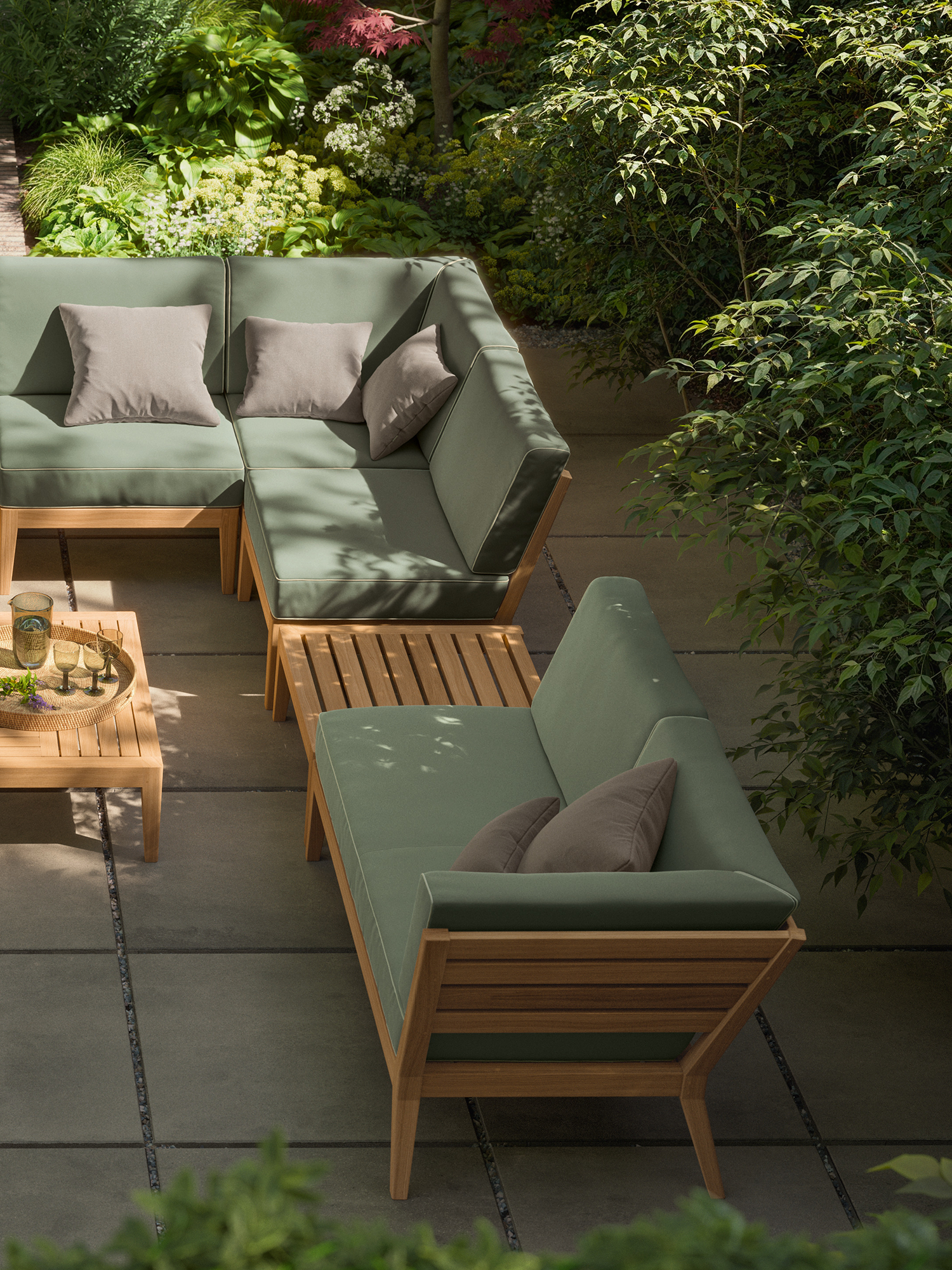 Am Ufer des Schwimmbeckens oder am Rand der Terrasse, auf einem Stadtbalkon oder mitten im Garten: Mit Elementen der Valencia Lounge findet ein Ruhepol in jeder luftigen Lage zur angemessenen Größe. Extra breit und besonders tief, bieten Chaiselongues, Mittelelemente und Eckmodule aus Teak mit ihren quer verlaufenden Sitz- und Rückenlehnen und ausgestellten Beinen viel Raum zum Anlehnen. Dicke, von Kedern gerahmte Polster und Federkissen in frischen Farben setzen dazu sommerliche Akzente.