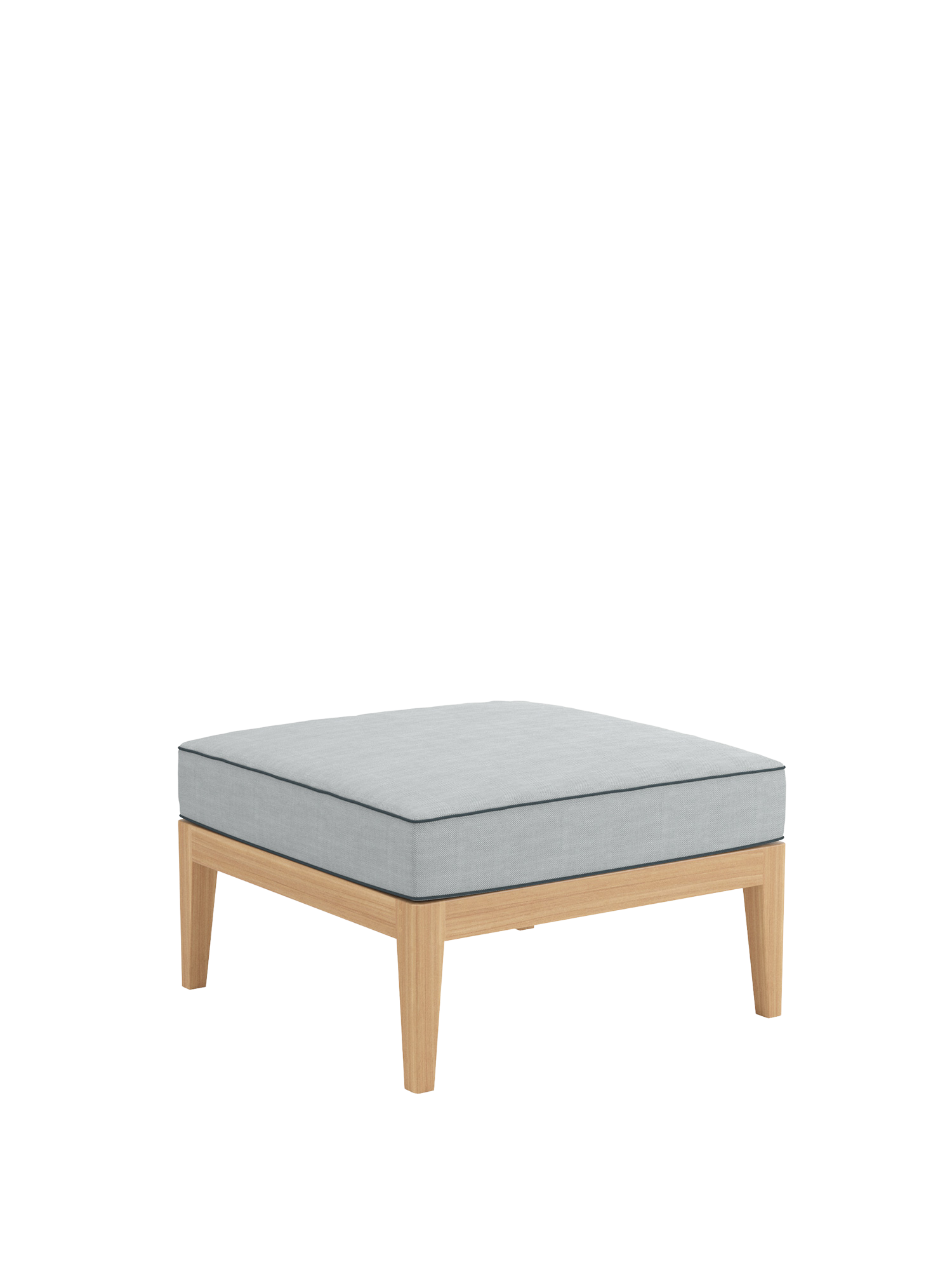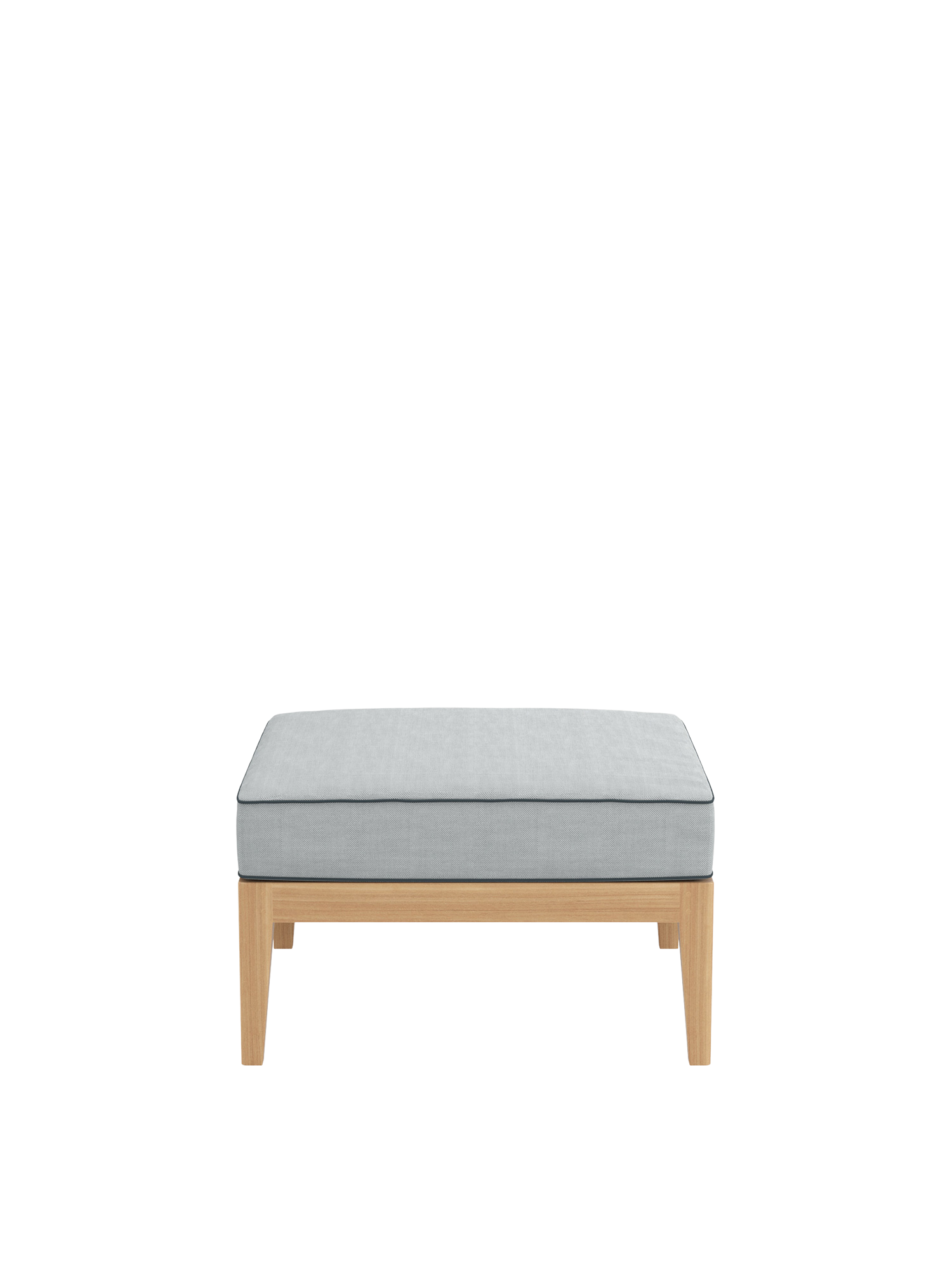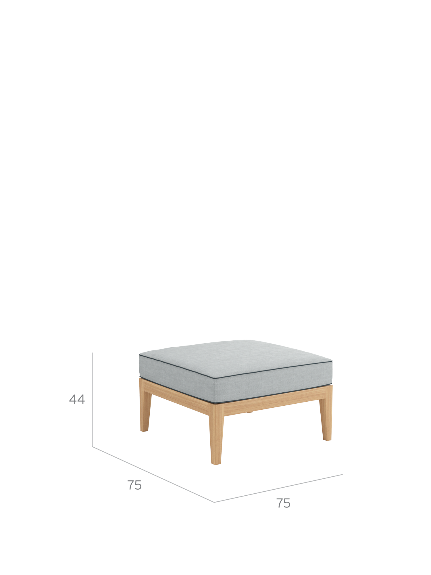 Der passende Hocker verlängert die großzügigen Elemente, entspannt angenehm die Beine und dient mit aufgelegtem Polster als Sitz.