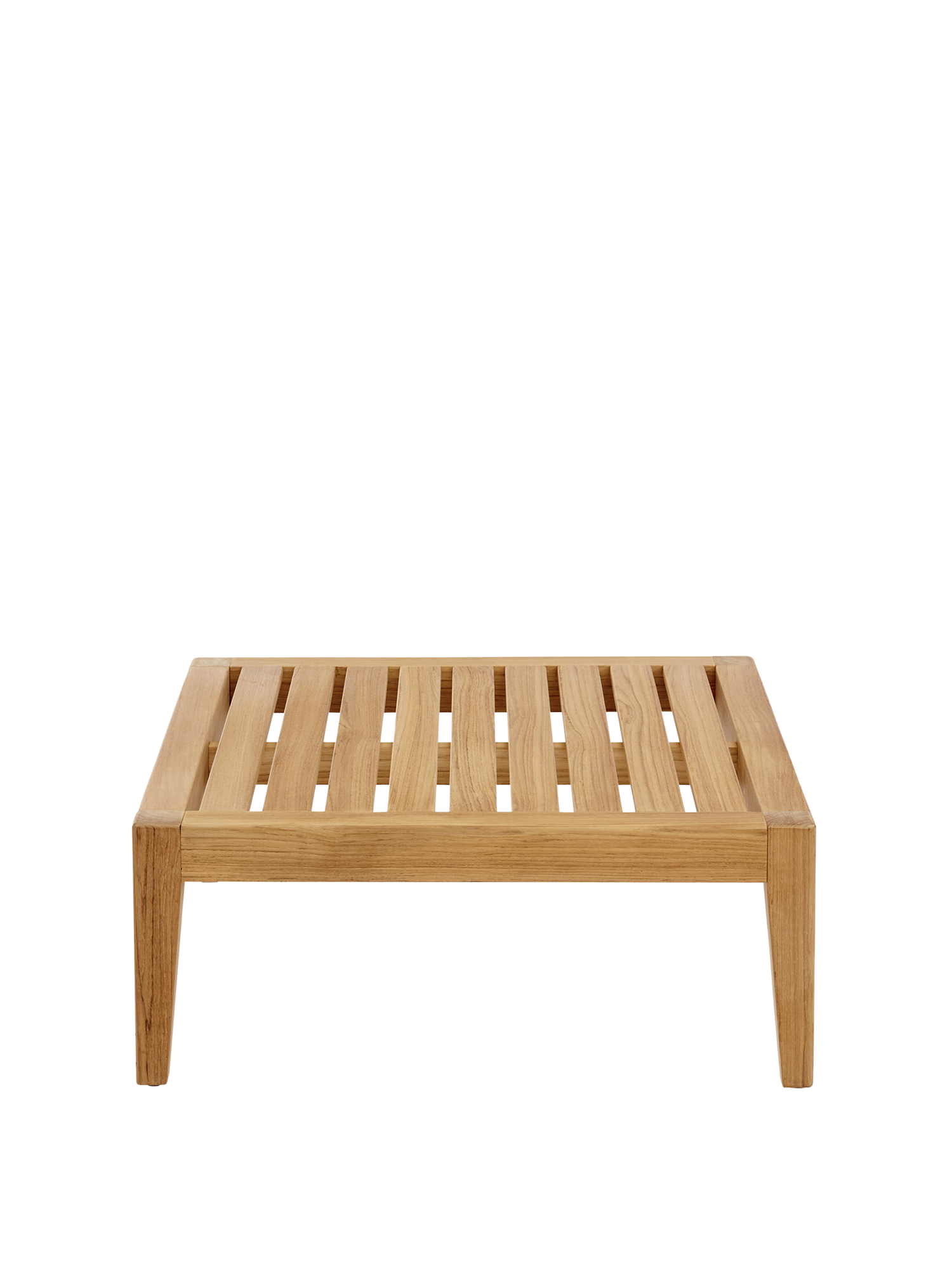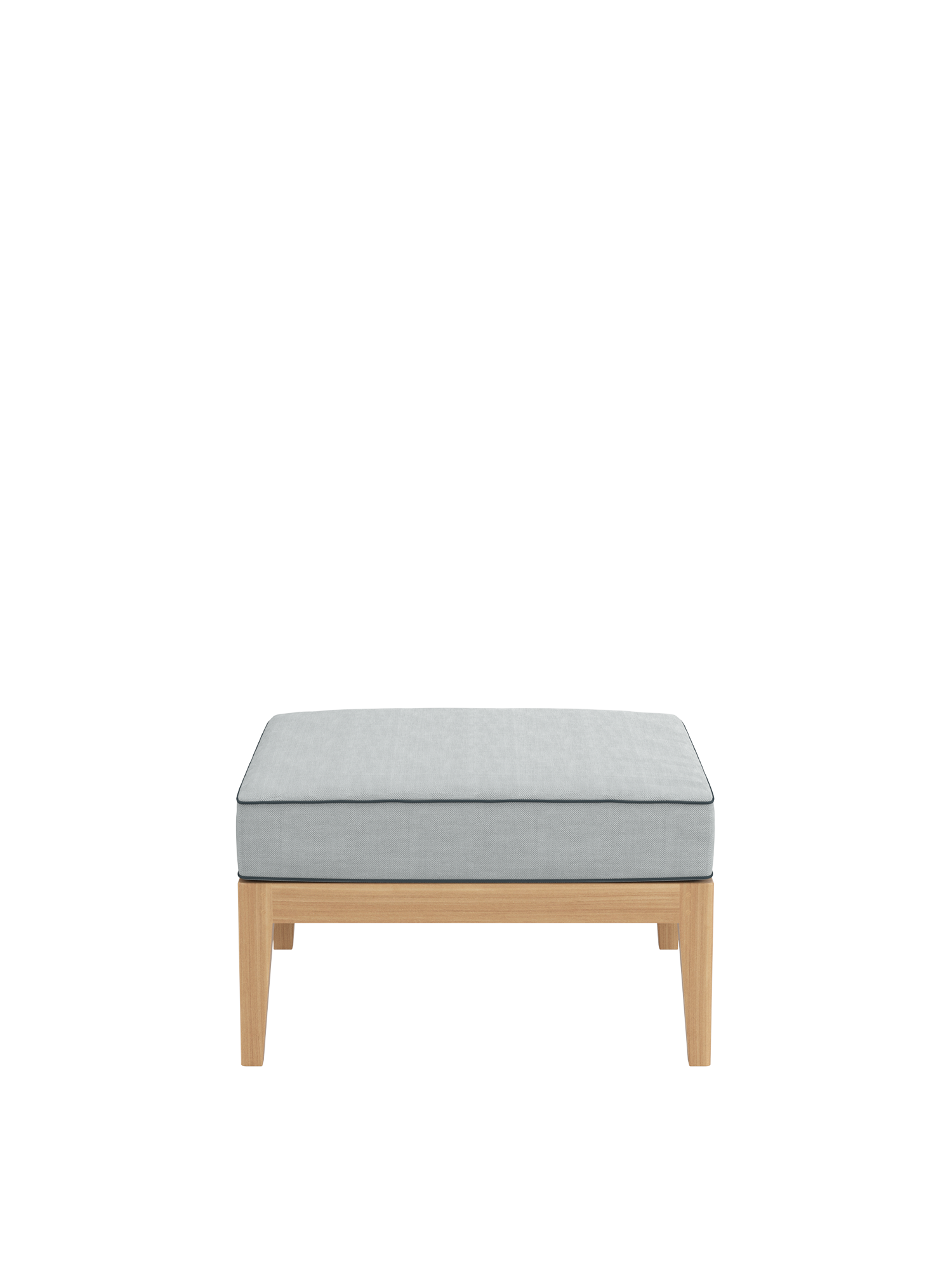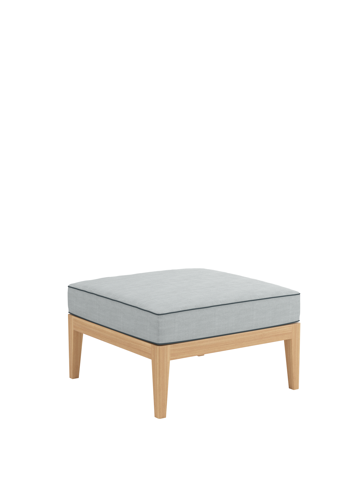 Der passende Hocker verlängert die großzügigen Elemente, entspannt angenehm die Beine und dient mit aufgelegtem Polster als Sitz.