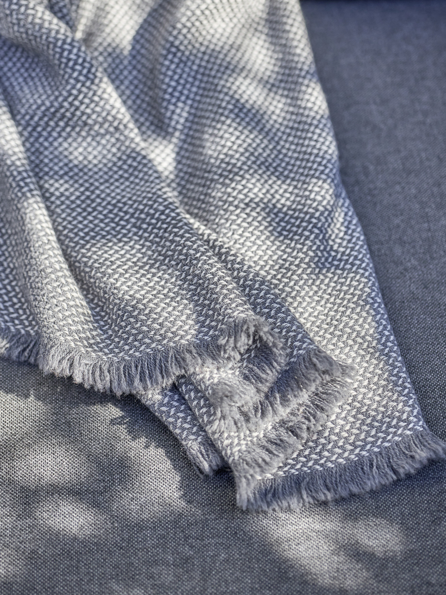 Die feine Struktur des leichten Plaids in Grau und Wollweiß entsteht aus dem Garn der Merinowolle des renommierten italienischen Herstellers Zegna Baruffa. Die schadstoffgeprüfte und zertifizierte Wollqualität ist besonders weich und angenehm temperaturregulierend.