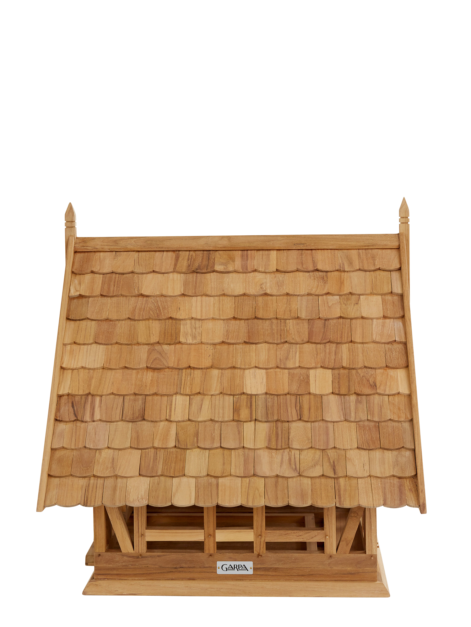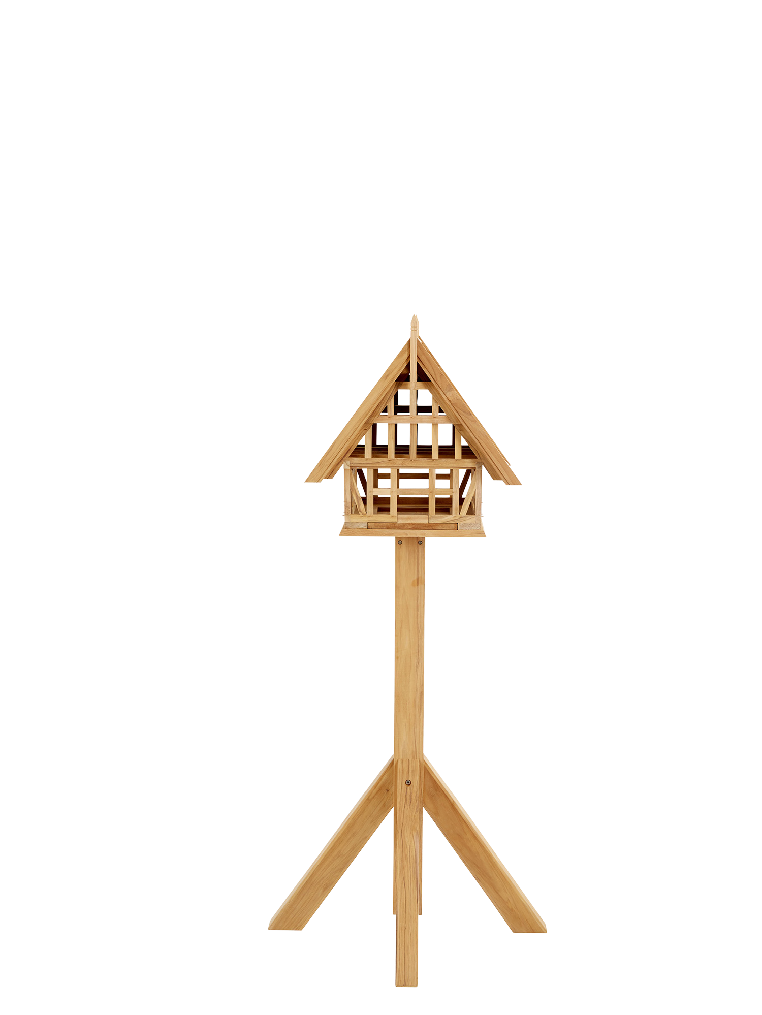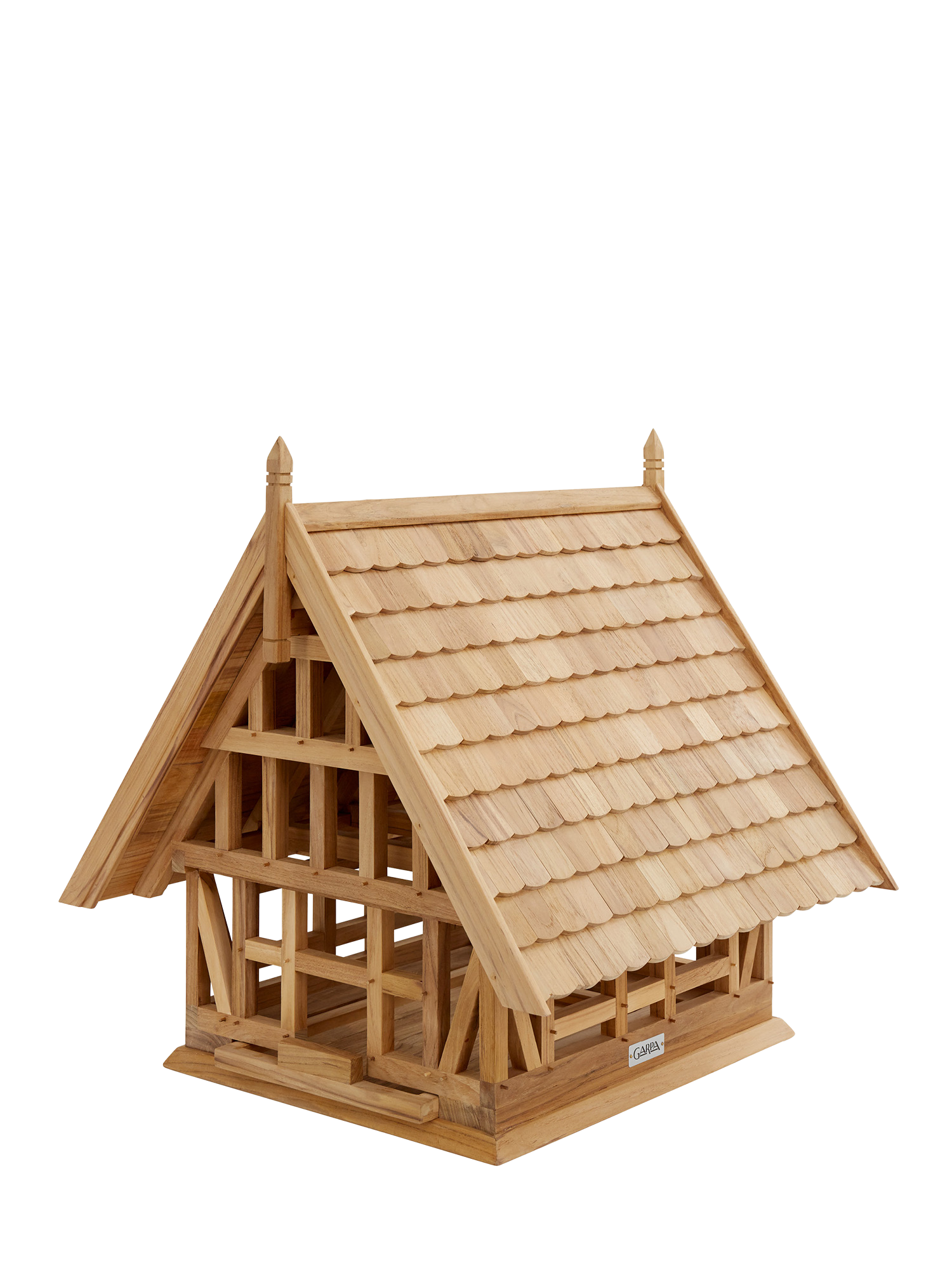 Das stattliche Vogelhaus ist ein Blickfang im Garten – und garantiert immer gut besucht. Sorgfältig gezimmertes Fachwerk aus Teakholz entsteht in solider Handwerksarbeit. Auch das Dach ist eine kleine Meisterleistung: Stück für Stück werden die einzelnen Holzschindeln zwischen den maßvoll verzierten Giebelspitzen zusammengefügt. Die Bodenplatte lässt sich wie eine Schublade herausziehen, was Futternachschub und Hausputz erleichtert. Durch einen Ständer mit vier Beinen bekommt das Haus seinen festen Stand.