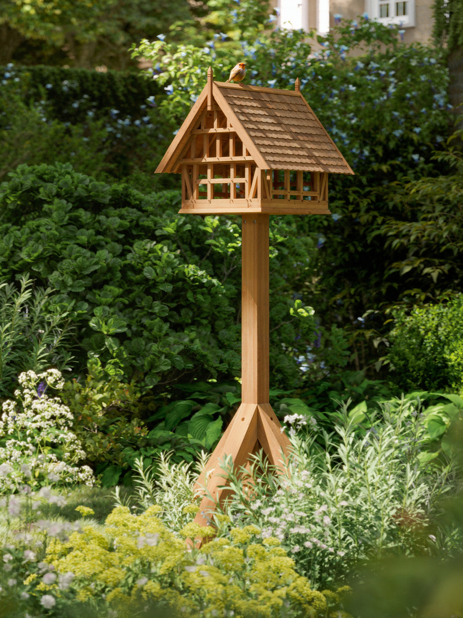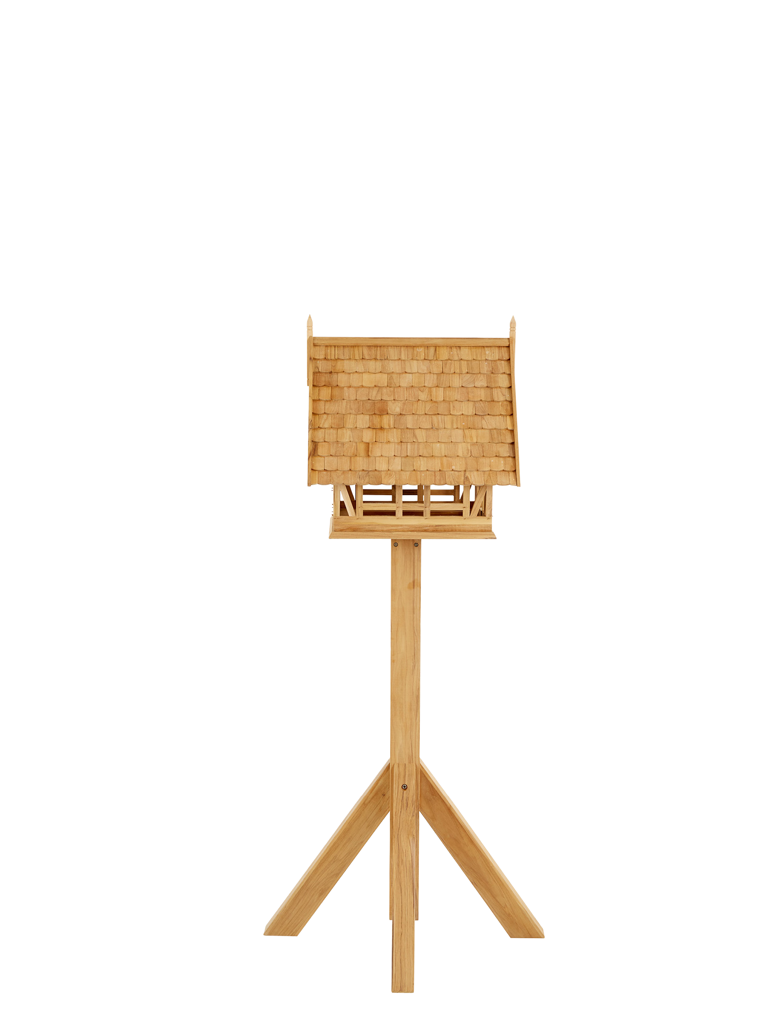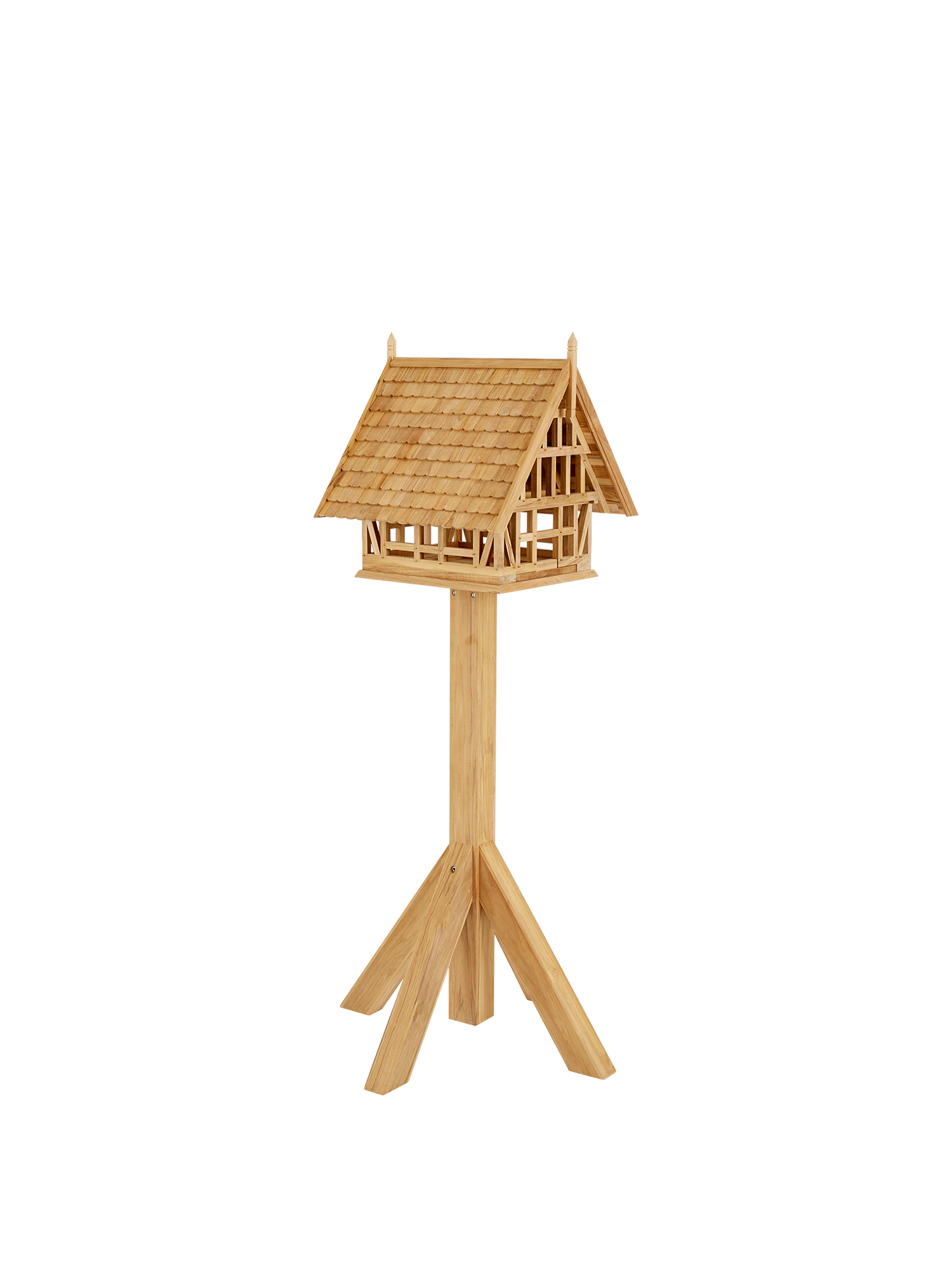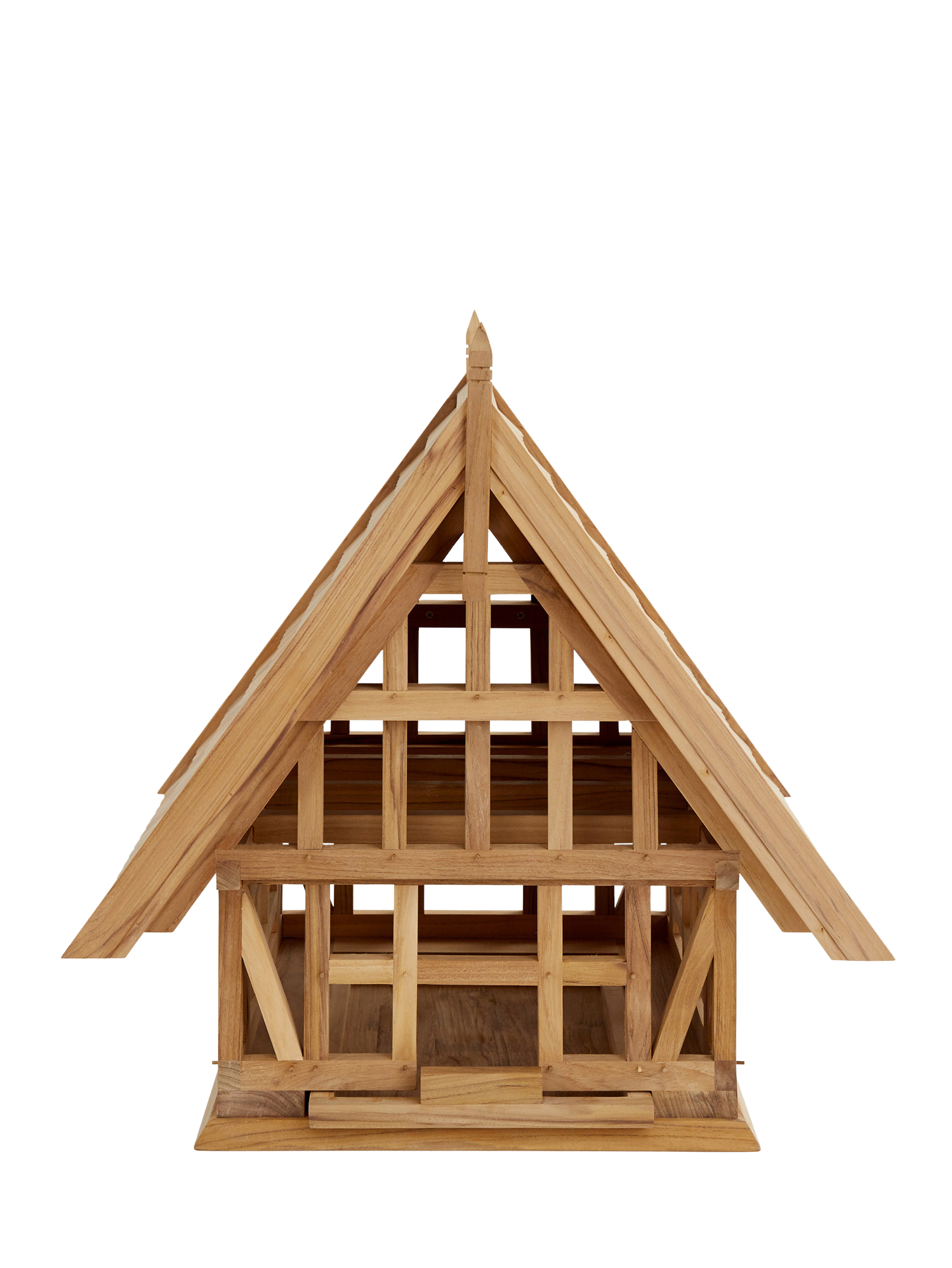 Das stattliche Vogelhaus ist ein Blickfang im Garten – und garantiert immer gut besucht. Sorgfältig gezimmertes Fachwerk aus Teakholz entsteht in solider Handwerksarbeit. Auch das Dach ist eine kleine Meisterleistung: Stück für Stück werden die einzelnen Holzschindeln zwischen den maßvoll verzierten Giebelspitzen zusammengefügt. Die Bodenplatte lässt sich wie eine Schublade herausziehen, was Futternachschub und Hausputz erleichtert. Durch einen Ständer mit vier Beinen bekommt das Haus seinen festen Stand.