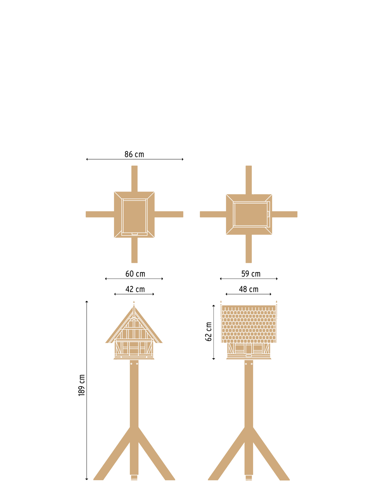 An windexponierten Standorten kann das stattliche Vogelhaus zusätzlich mit einem Erdspieß im Boden verankert werden. Bitte beachten Sie: Der Fuß entwickelt schneller eine graue Patina als das Haus, das vom Dach vor Witterungseinflüssen geschützt wird.
