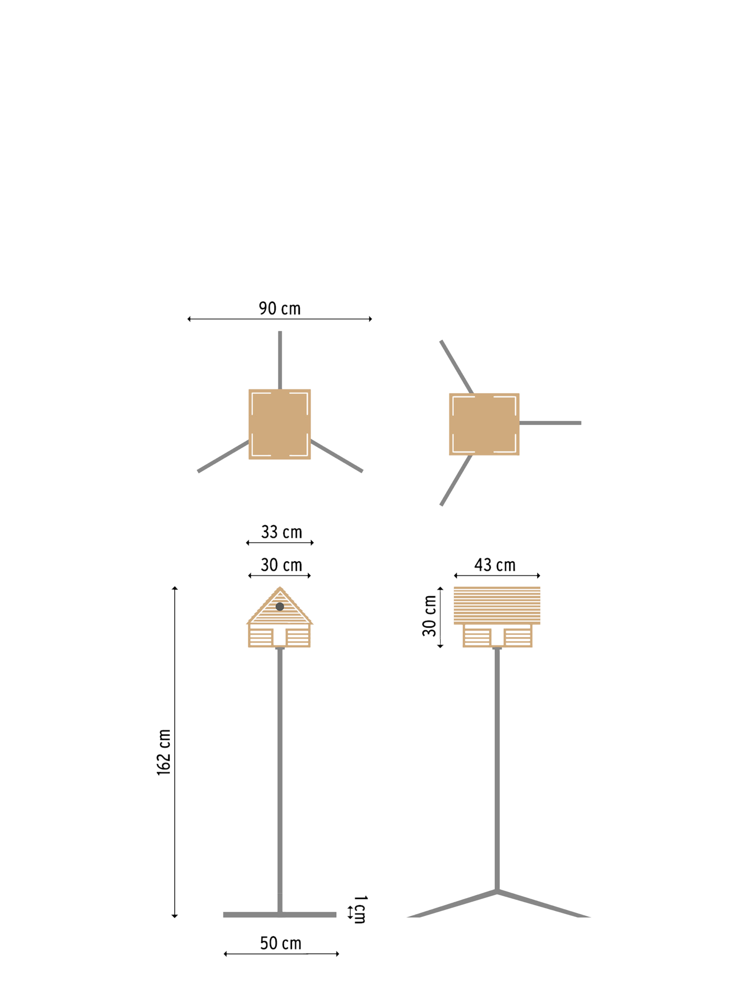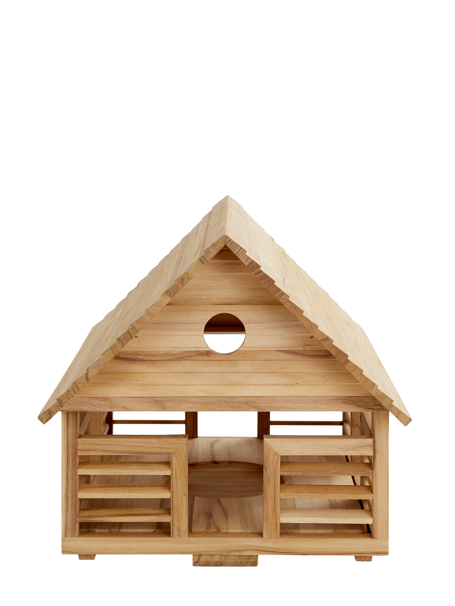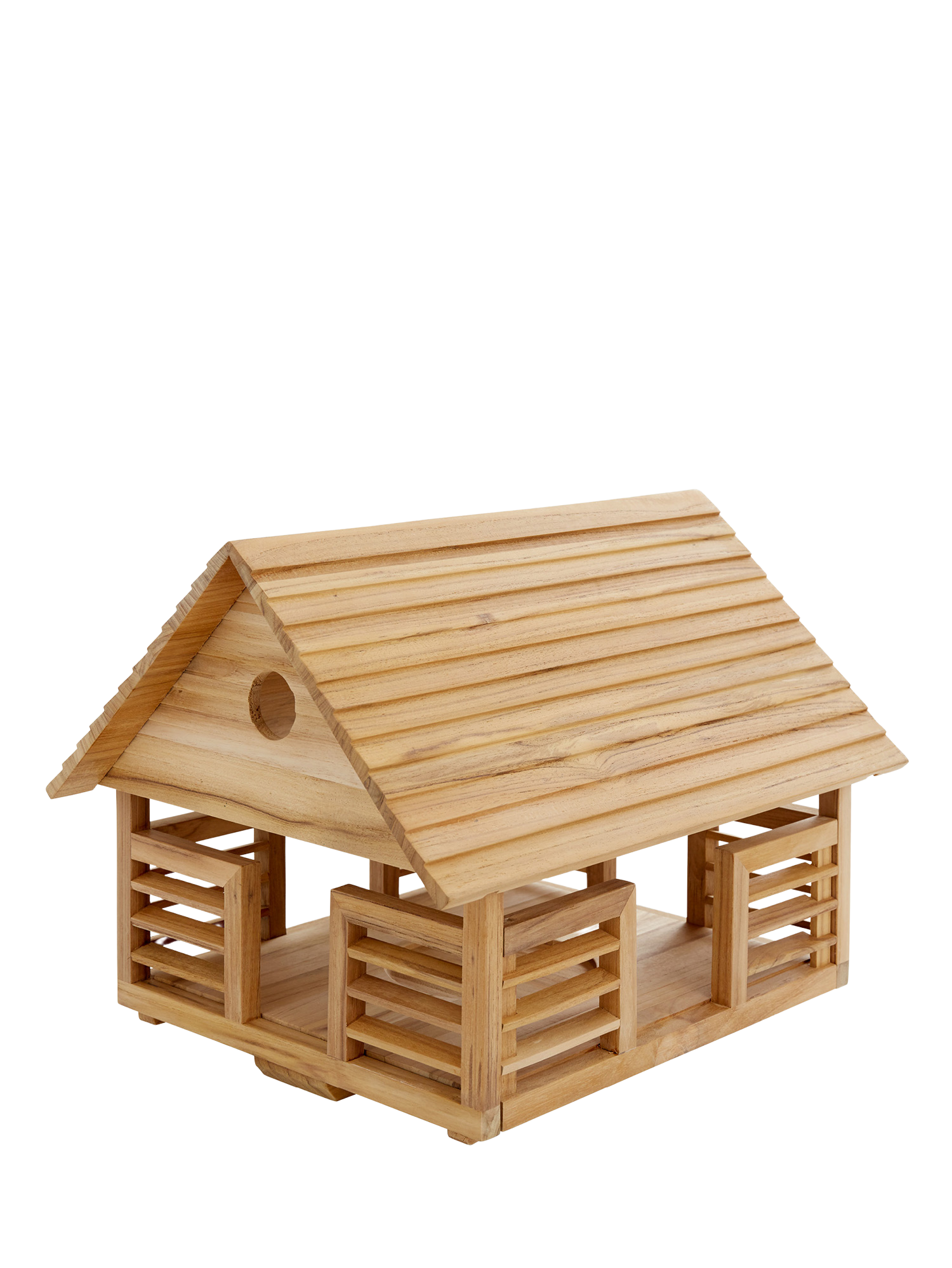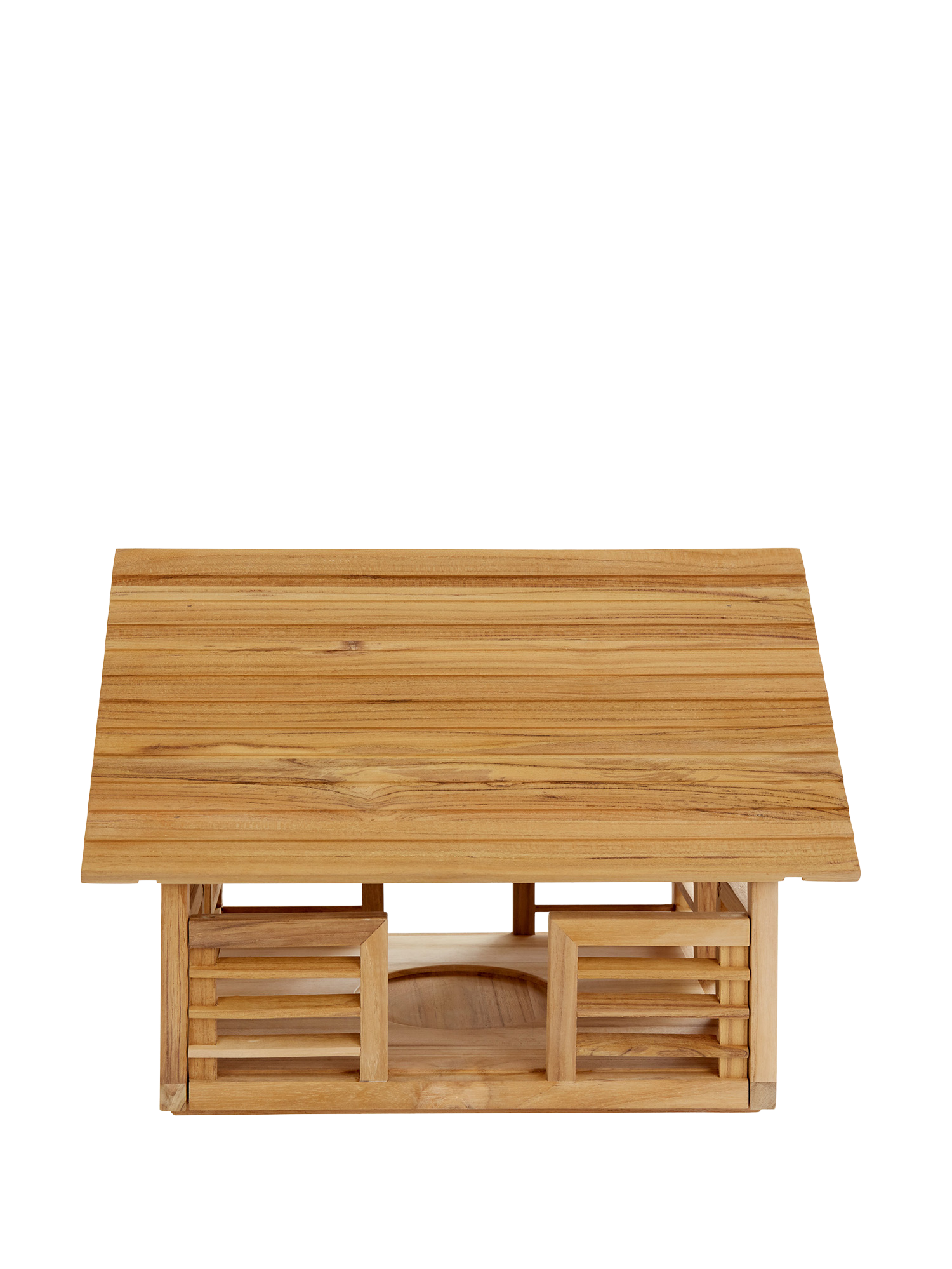 Die offene Bauweise des filigranen Futterplatzes erlaubt kleinen Vögeln wachsame Blicke nach allen Seiten und Menschen ungehinderte Sicht auf das lebhafte Geschehen. An der Längsseite lässt sich mit einem Handgriff die Futterlade herausziehen. In bester Handwerkstradition aus Teakholz gefertigt, steht das Vogelhaus bei dieser Terrassenlösung auf einem stabilen Ständer aus lackiertem Stahl mit quadratischem Fuß, der auf der Terrasse für Standfestigkeit sorgt.