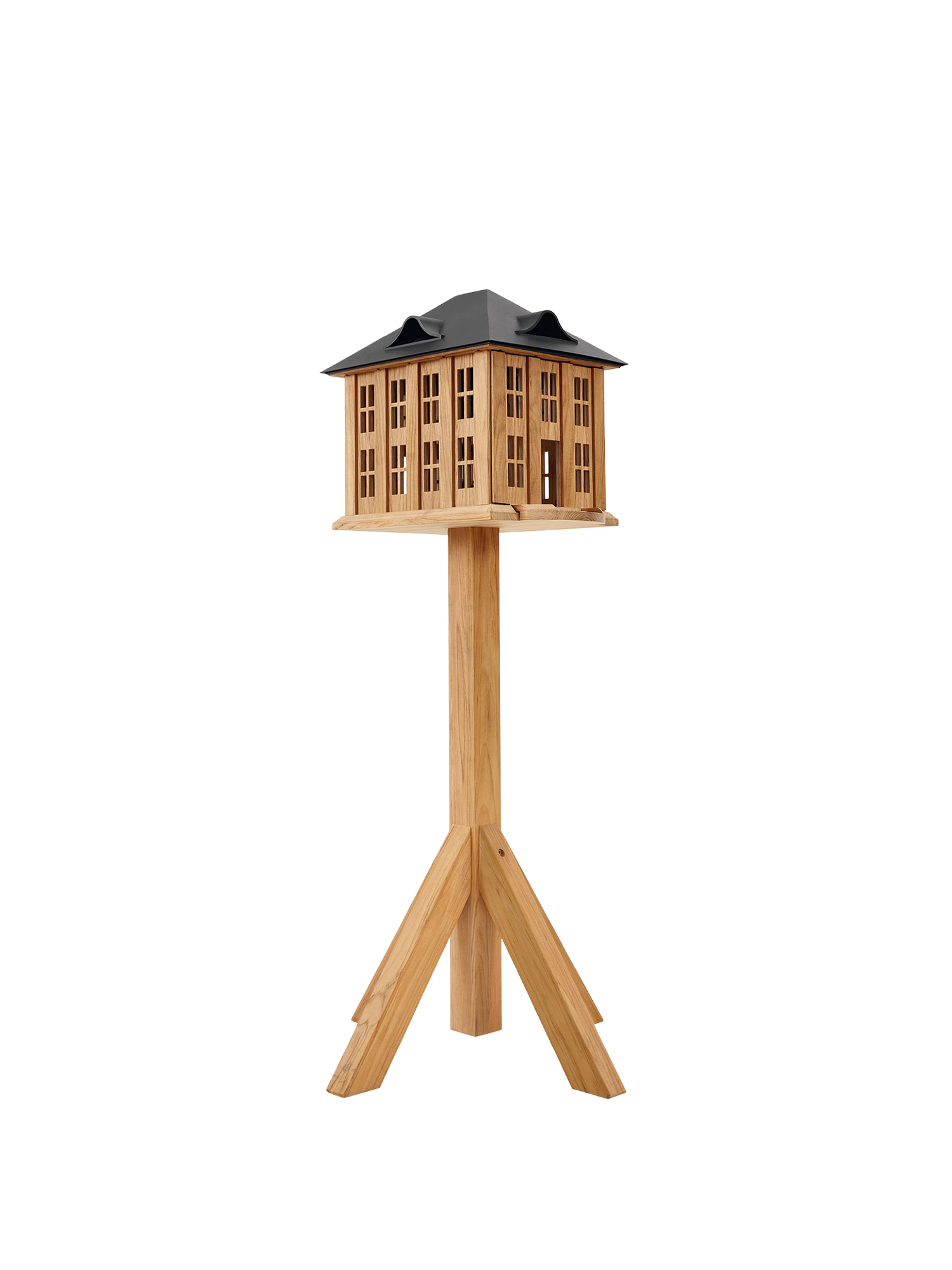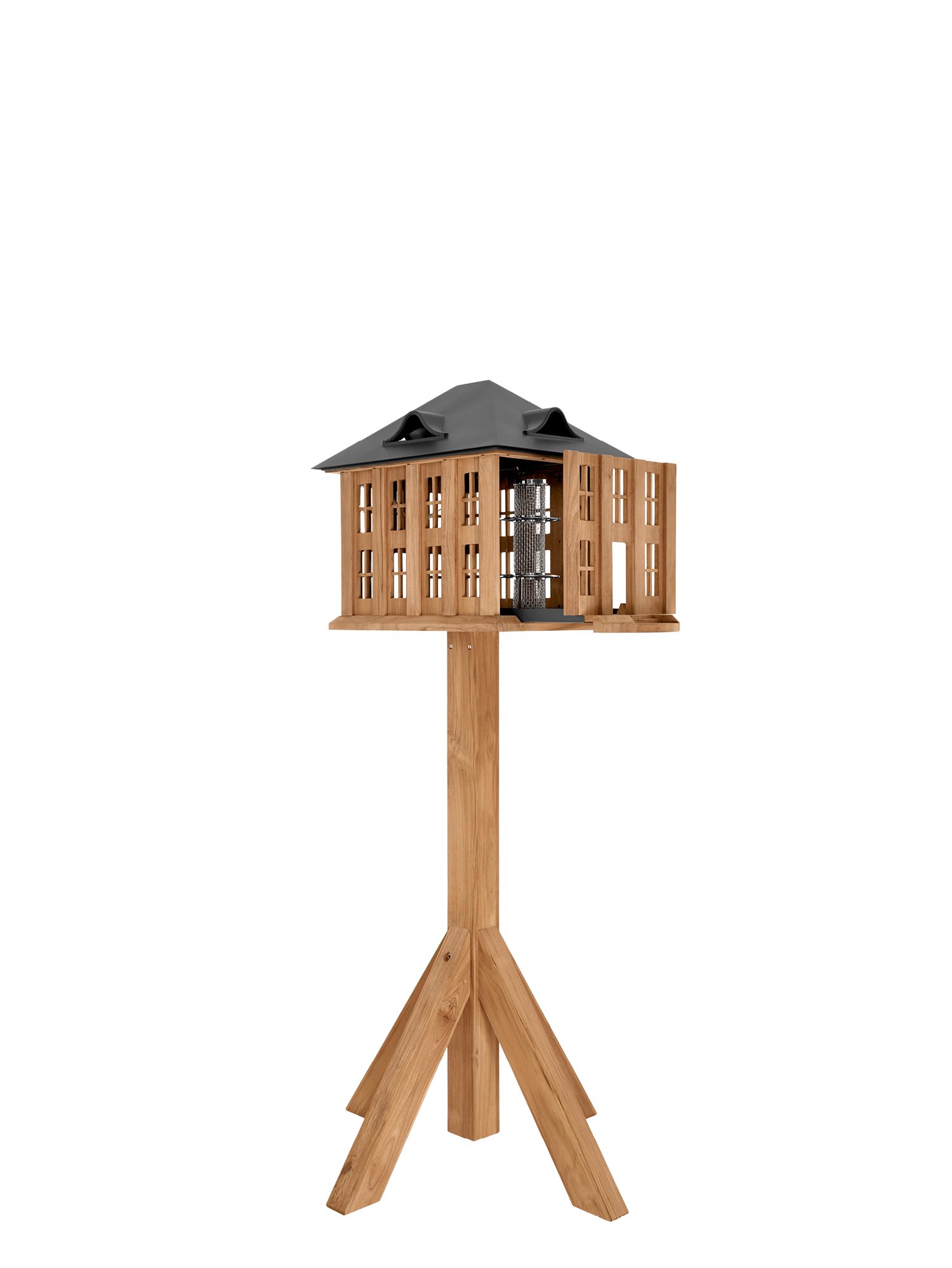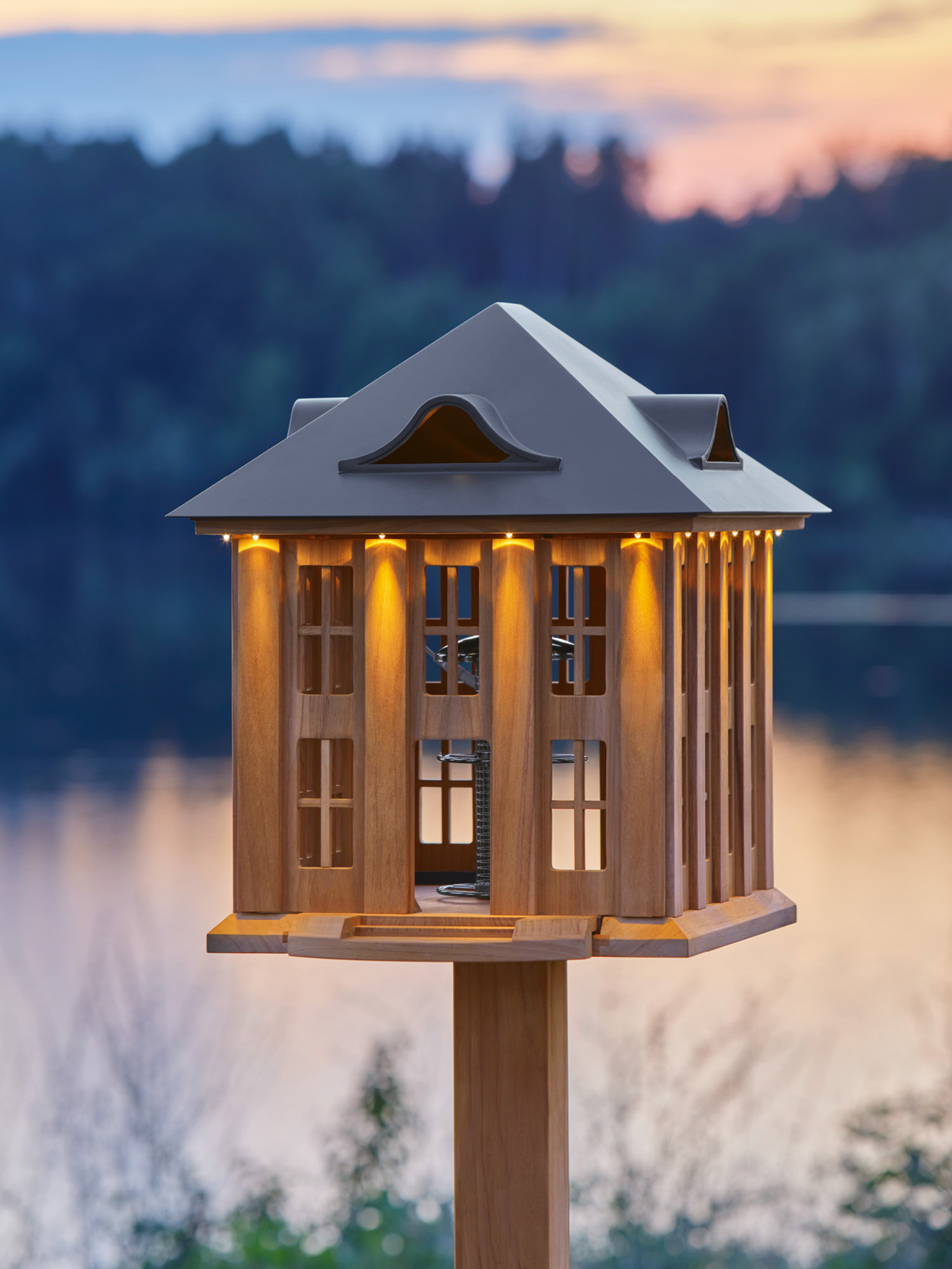 Als solides Futterhaus aus Teak wird es nun auch für Gartenvögel zur Attraktion. Das Dach mit seinen zierlichen Gauben besteht aus pulverbeschichtetem Edelstahlblech. Im Innern gibt es eine Futtersäule aus Edelstahl, sie kann samt Front herausgezogen werden. Die warmweiße LED-Beleuchtung mit Akkubetrieb lässt sich per Fernbedienung ein- und ausschalten.