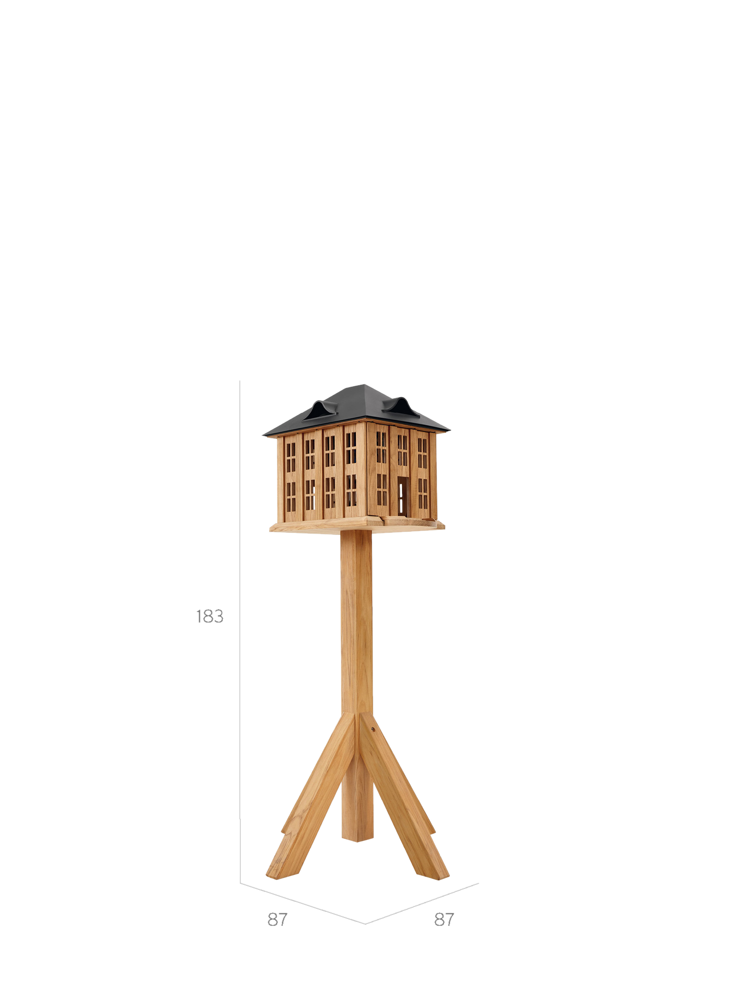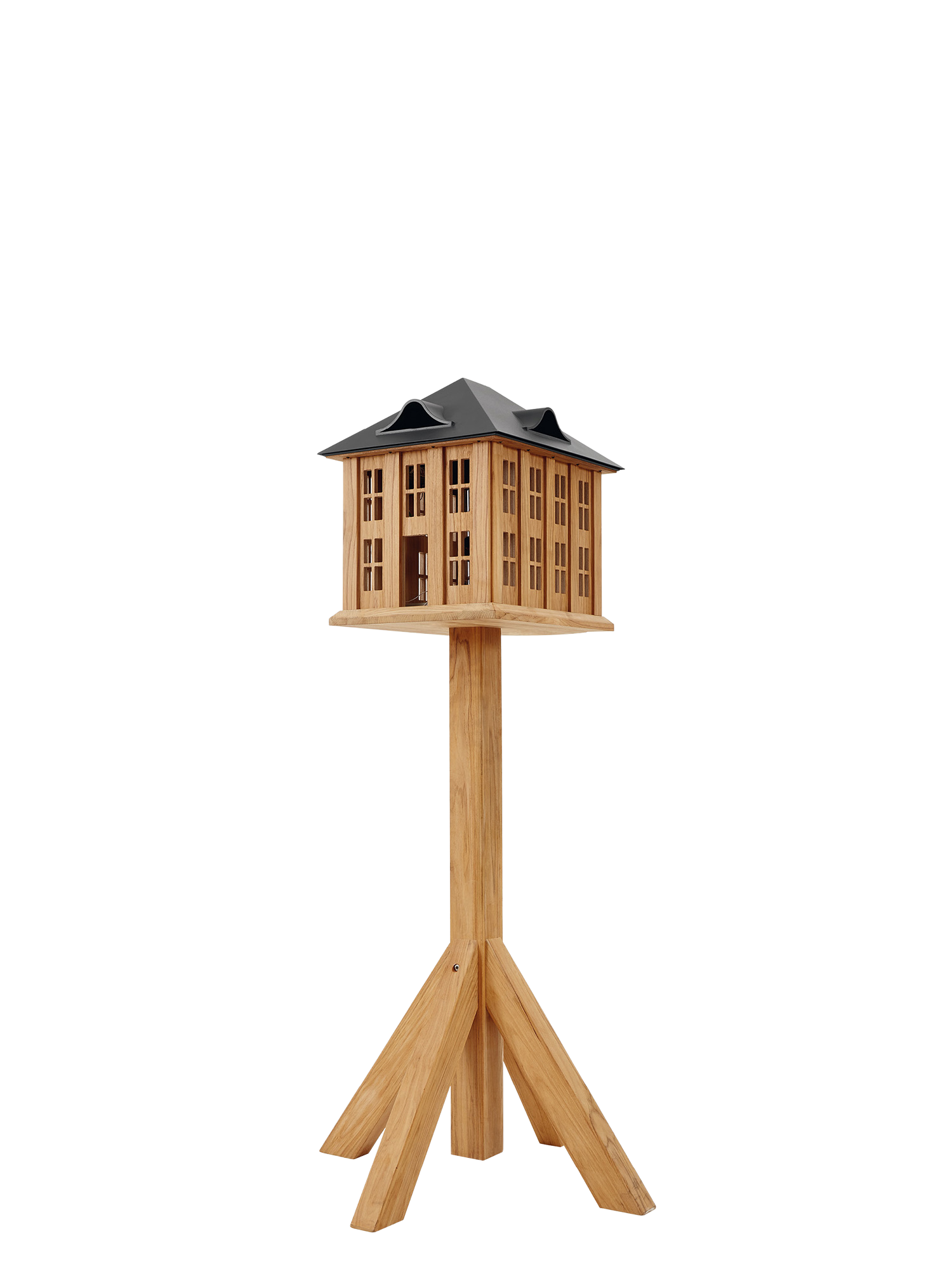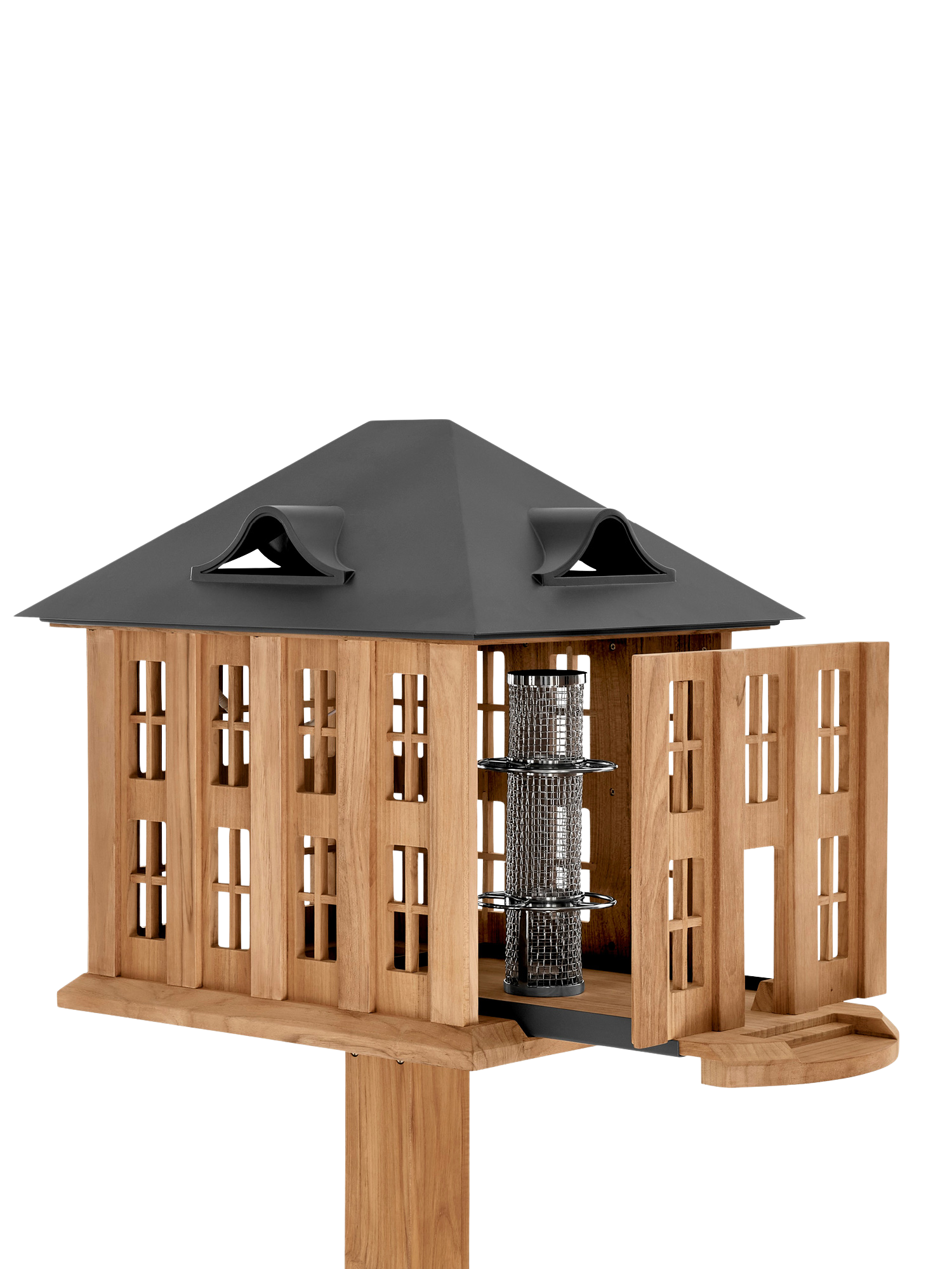 Als solides Futterhaus aus Teak wird es nun auch für Gartenvögel zur Attraktion. Das Dach mit seinen zierlichen Gauben besteht aus pulverbeschichtetem Edelstahlblech. Im Innern gibt es eine Futtersäule aus Edelstahl, sie kann samt Front herausgezogen werden. Die warmweiße LED-Beleuchtung mit Akkubetrieb lässt sich per Fernbedienung ein- und ausschalten.