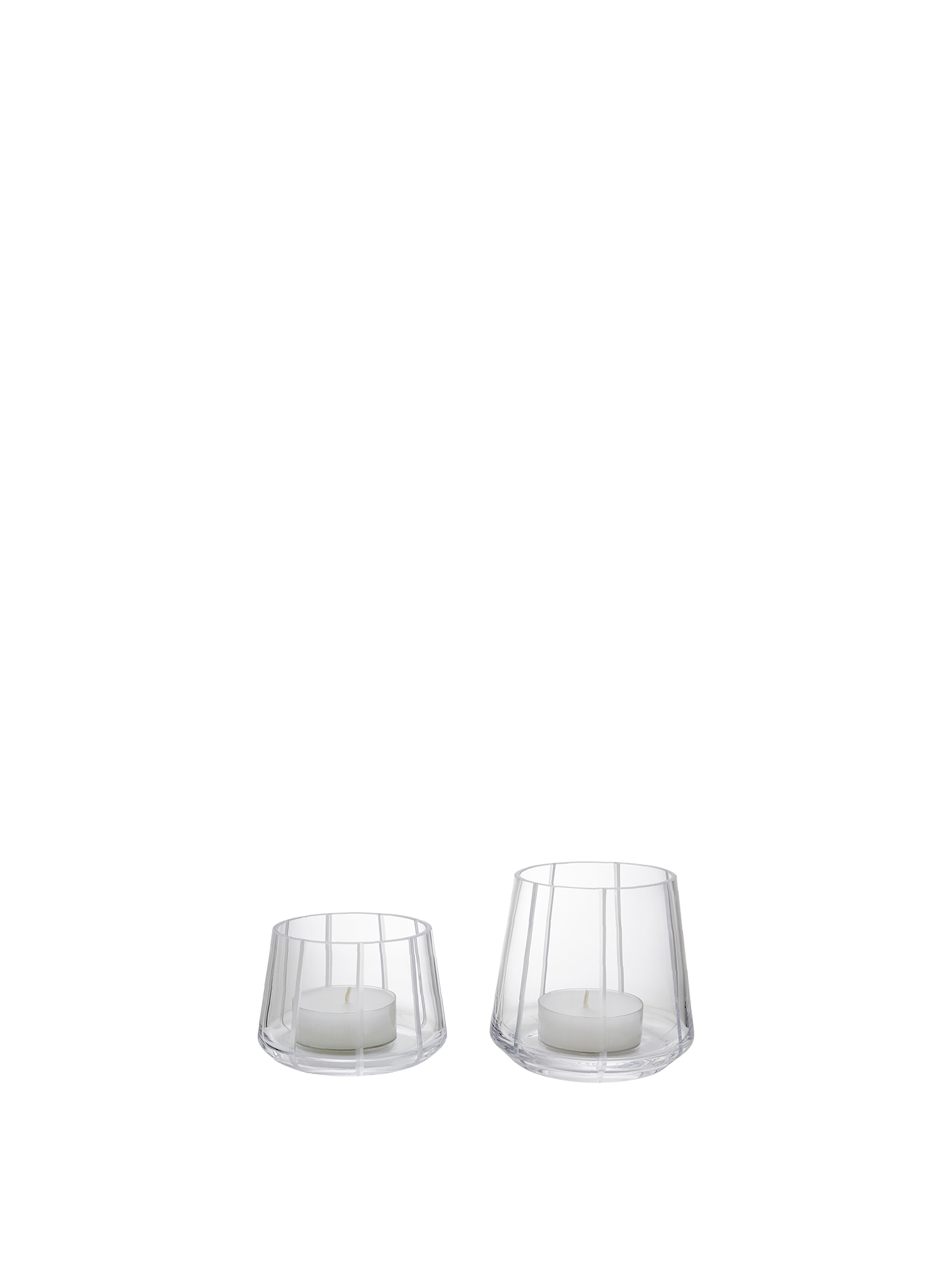 Jeweils acht senkrechte Linien zieren die leicht konisch geformten Windlichter in zwei Größen. Der Mattschliff steht in schönem Kontrast zu den funkelnd polierten Kristallglasflächen. Das Set wird exklusiv für Garpa in einer deutschen Glashütte mundgeblasen und von Hand geschliffen. Passende Teelichter liefern wir mit.